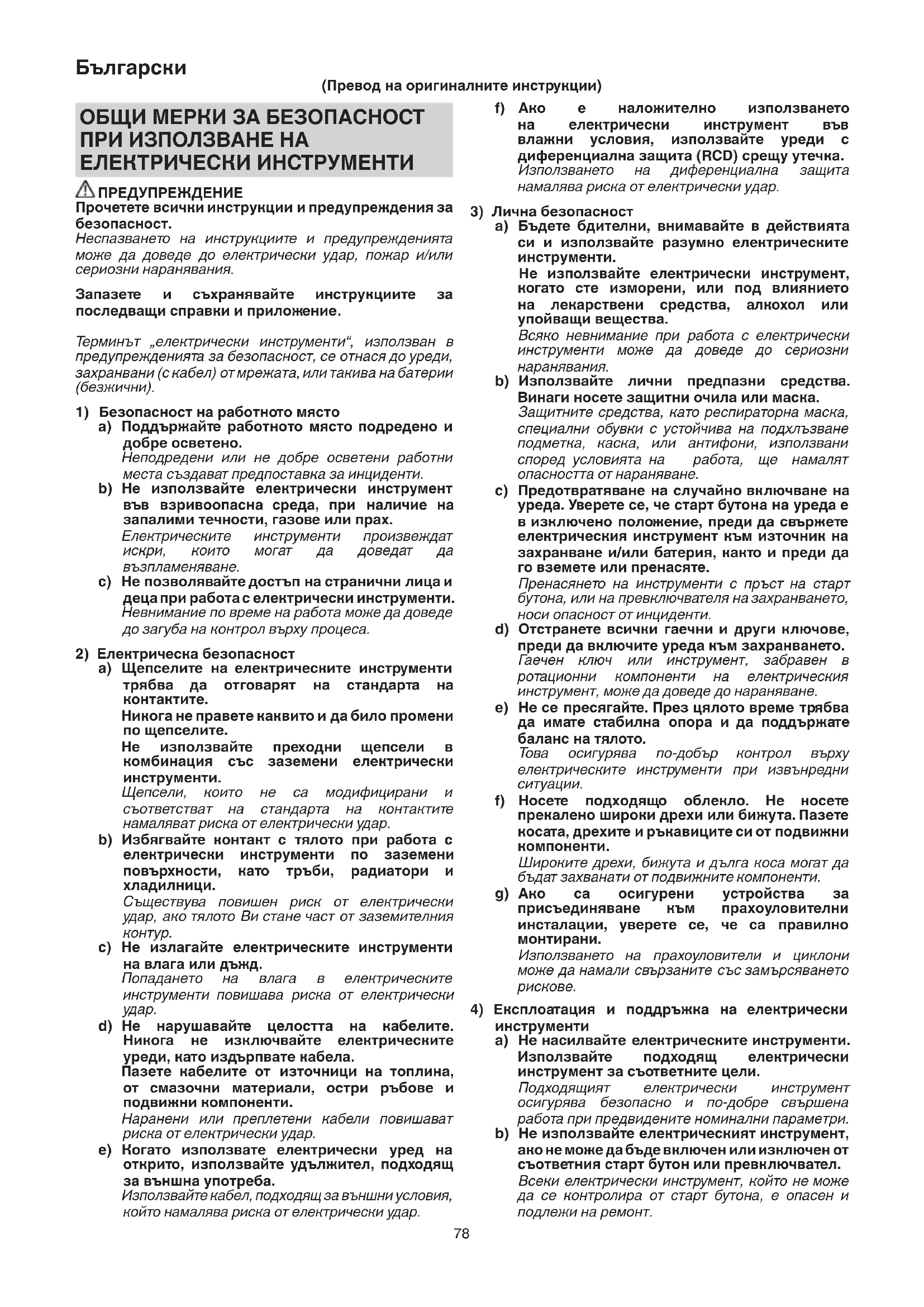 безопасно и по-добре свършена работа при предвидените номинални параметри. b) Не използвайте електрическият инструмент, ако не може да бъде включен или изключен от съответния старт бутон или превключвател. Всеки електрически инструмент, който не може да се контролира от старт бутона, е опасен и подлежи на ремонт. ОБЩИ МЕРКИ ЗА БЕЗОПАСНОСТ ПРИ ИЗПОЛЗВАНЕ НА ЕЛЕКТРИЧЕСКИ ИНСТРУМЕНТИ ПРЕДУПРЕЖДЕНИЕ Прочетете всички инструкции и предупреждения за безопасност. Неспазването на инструкциите и предупрежденията може да доведе до електрически удар, пожар и/или сериозни наранявания. Запазете и съхранявайте инструкциите за последващи справки и приложение. Терминът „електрически инструменти“, използван в предупрежденията за безопасност, се отнася до уреди, захранвани (с кабел) от мрежата, или такива на батерии (безжични).