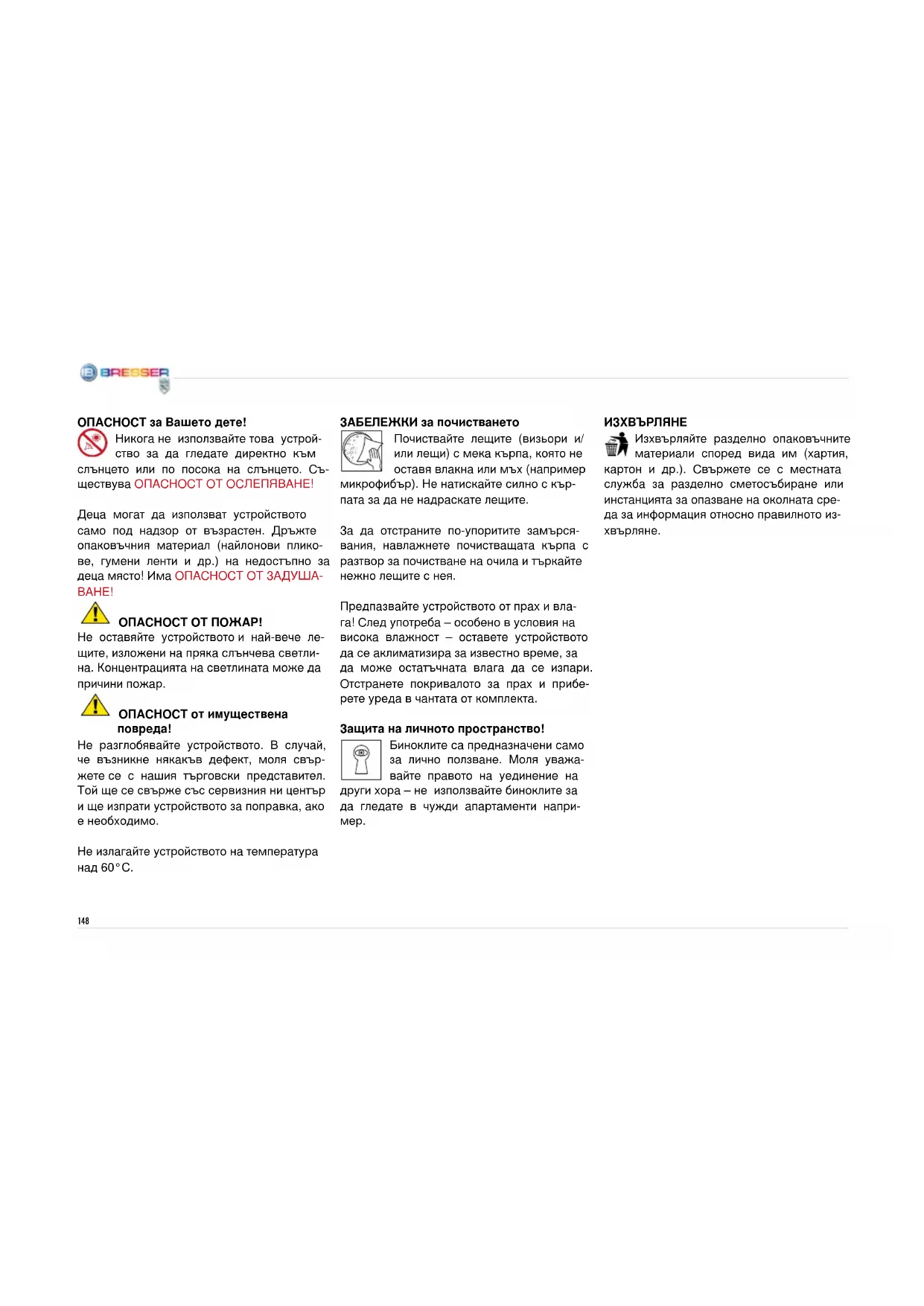 Не разглобявайте устройството. В случай, че възникне някакъв дефект, моля свър- жете се с нашия търговски представител. Той ще се свърже със сервизния ни център и ще изпрати устройството за поправка, ако е необходимо. Не излагайте устройството на температура над 60°C. ЗАБЕЛЕЖКИ за почистването Почиствайте лещите (визьори и/ или лещи) с мека кърпа, която не оставя влакна или мъх (например микрофибър). Не натискайте силно с кър- пата за да не надраскате лещите. За да отстраните по-упоритите замърся- вания, навлажнете почистващата кърпа с разтвор за почистване на очила и търкайте нежно лещите с нея. Предпазвайте устройството от прах и вла- га! След употреба – особено в условия на висока влажност – оставете устройството да се аклиматизира за известно време, за да може остатъчната влага да се изпари. Отстранете покривалото за прах и прибе- рете уреда в чантата от комплекта. Защита на личното пространство! Биноклите са предназначени само за лично ползване. Моля уважа- вайте правото на уединение на други хора – не използвайте биноклите за да гледате в чужди апартаменти напри-