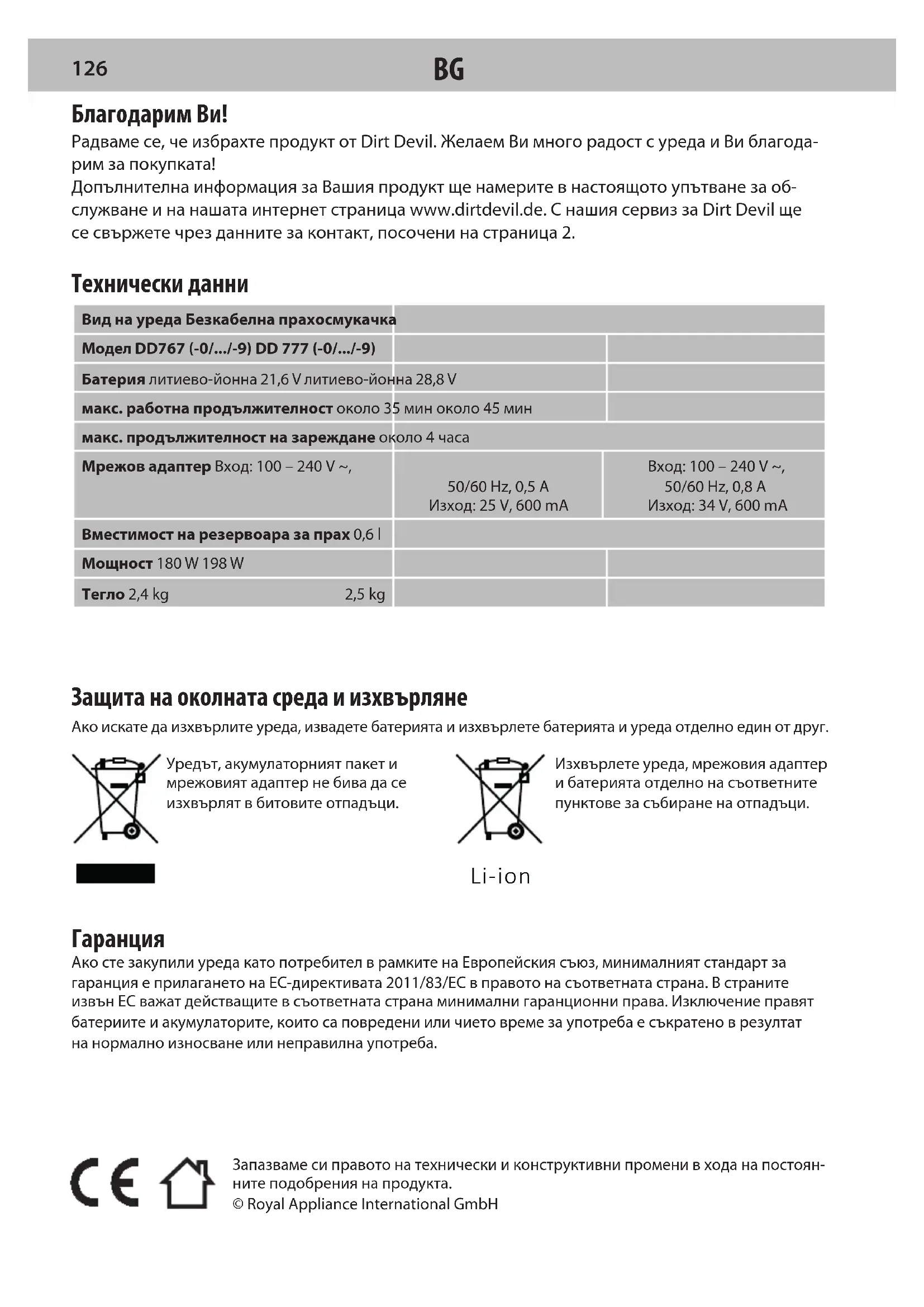 125Запазваме си правото на технически и конструктивни промени в хода на постоян-ните подобрения на продукта.© Royal Appliance International GmbH Благодарим Ви! Радваме се, че избрахте продукт от Dirt Devil. Желаем Ви много радост с уреда и Ви благода- рим за покупката! Допълнителна информация за Вашия продукт ще намерите в настоящото упътване за об- служване и на нашата интернет страница www.dirtdevil.de. С нашия сервиз за Dirt Devil ще сесвържете чрез данните за контакт, посочени на страница 2. Технически данни Вид на уреда Безкабелна прахосмукачкаМодел DD767 (-0/.../-9) DD 777 (-0/.../-9)Батерия литиево-йонна 21,6 V литиево-йонна 28,8 Vмакс. работна продължителност около 35 мин около 45 минмакс. продължителност на зареждане около 4 часаМрежов адаптер Вход: 100 – 240 V ~, 50/60 Hz, 0,5 A Изход: 25 V, 600 mAВход: 100 – 240 V ~, 50/60 Hz, 0,8 A Изход: 34 V, 600 mAВместимост на резервоара за прах 0,6 lМощност 180 W 198 WТегло 2,4 kg 2,5 kg Защита на околната среда и изхвърляне Ако искате да изхвърлите уреда, извадете батерията и изхвърлете батерията и уреда отделно един от друг.Уредът, акумулаторният пакет и мрежовият адаптер не бива да се изхвърлят в битовите отпадъци.Изхвърлете уреда, мрежовия адаптер и батерията отделно на съответните пунктове за събиране на отпадъци.