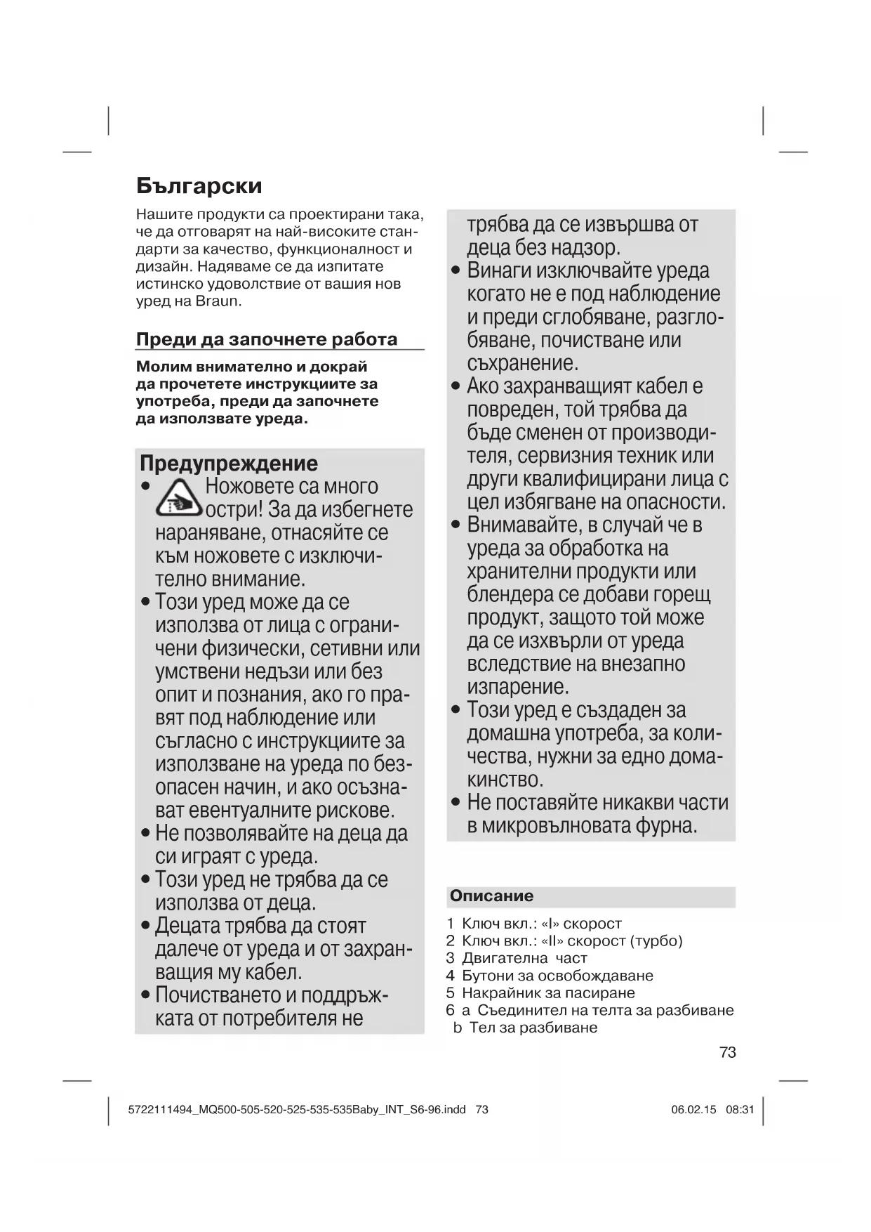5722111494_MQ500-505-520-525-535-535Baby_INT_S6-96.indd 725722111494_MQ500-505-520-525-535-535Baby_INT_S6-96.indd 72 06.02.15 08:3106.02.15 08:3173 Нашите продукти са проектирани така, че да отговарят на най-високите стан- дарти за качество, функционалност и дизайн. Надяваме се да изпитате истинско удоволствие от вашия нов уред на Braun. Преди да започнете работа Молим внимателно и докрай да прочетете инструкциите за употреба, преди да започнете да използвате уреда. Предупреждение