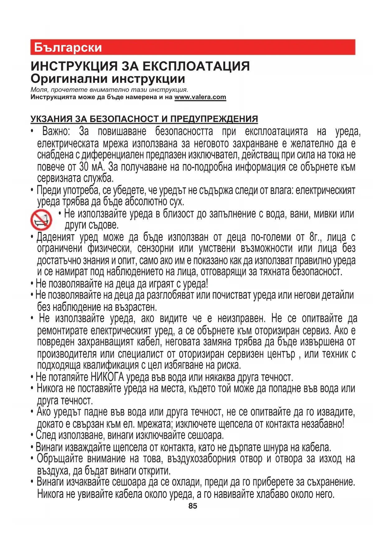 ИНСТРУКЦИЯ ЗА ЕКСПЛОАТАЦИЯ Оригинални инструкции Моля, прочетете внимателно тази инструкция. Инструкцията може да бъде намерена и на www.valera.com