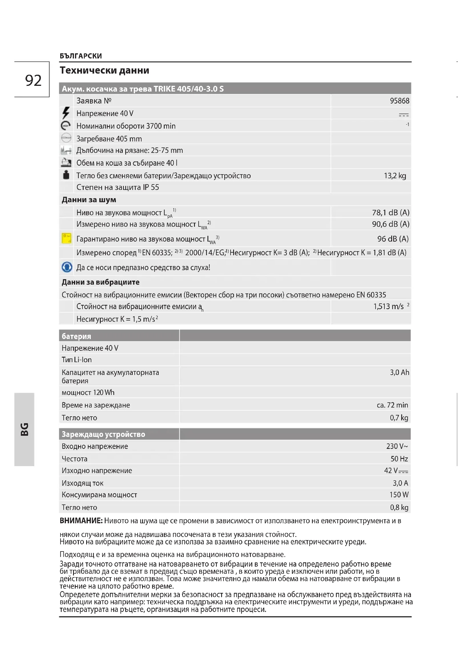 0,7 kg Зареждащо устройство Входно напрежение 230 V~ Честота 50 Hz Изходно напрежение 42 V Изходящ ток 3,0 A Консумирана мощност 150 W Tегло нето 0,8 kg ВНИМАНИЕ: Нивото на шума ще се промени в зависимост от използването на електроинструмента и в някои случаи може да надвишава посочената в тези указания стойност. Нивото на вибрациите може да се използва за взаимно сравнение на електрическите уреди. Подходящ е и за временна оценка на вибрационното натоварване. Заради точното отгатване на натоварването от вибрации в течение на определено работно време би трябвало да се вземат в предвид също времената , в които уреда е изключен или работи, но в действителност не е използван. Това може значително да намали обема на натоварване от вибрации в течение на цялото работно време. Определете допълнителни мерки за безопасност за предпазване на обслужването пред въздействията на вибрации като например: техническа поддръжка на електрическите инструменти и уреди, поддържане на температурата на ръцете, организация на работните процеси.93