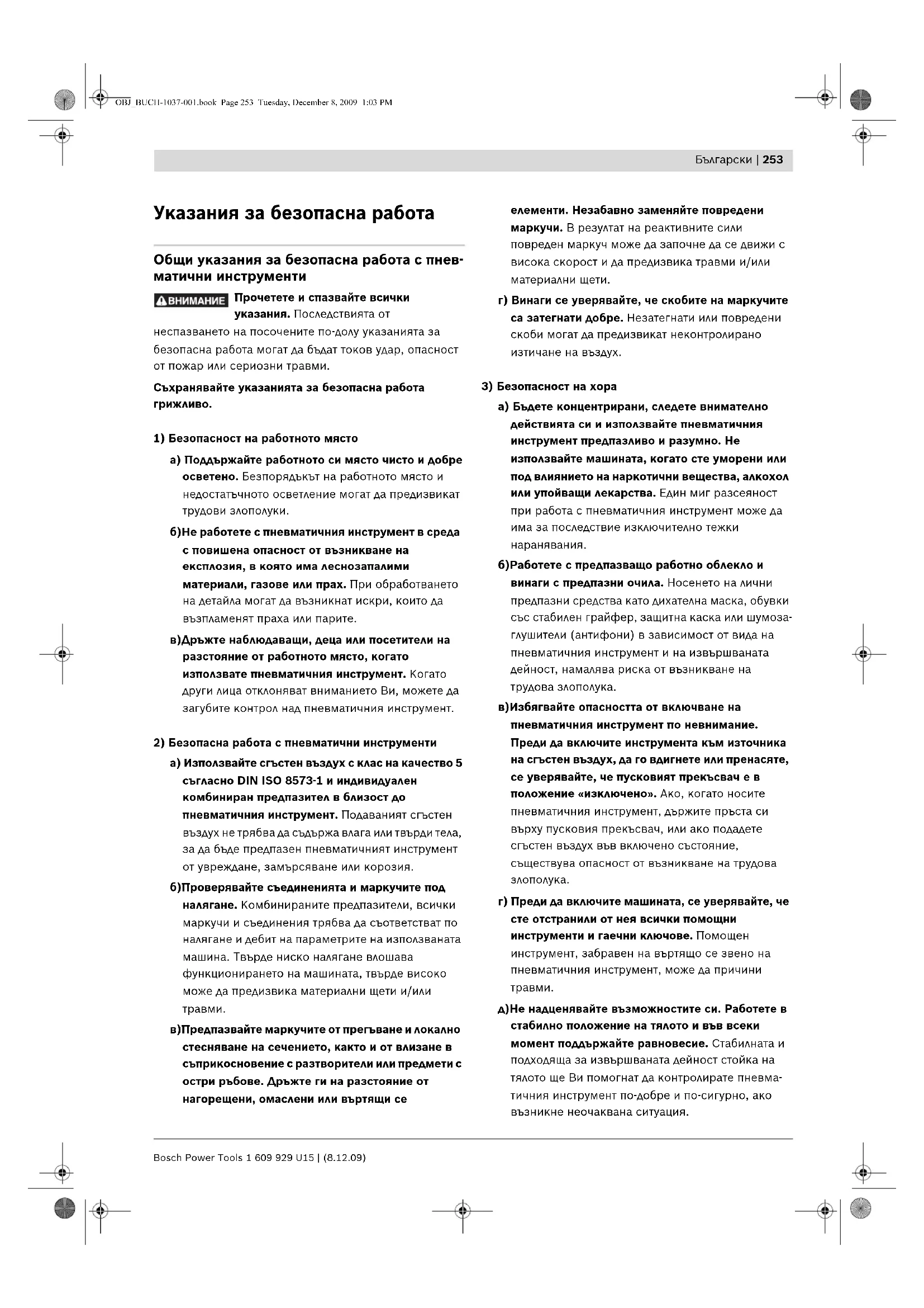 а)Допускайте Вашият пневматичен инструмент да бъде ремонтиран само от квалифицирани техници и само с оригинални резервни части. С това се гарантира, че сигурността на пневматич- ния инструмент ще бъде запазена. OBJ_BUCH-1037-001.book Page 254 Tuesday, December 8, 2009 1:03 PMБългарски | 255 Bosch Power Tools 1 609 929 U15 | (8.12.09) Указания за безопасна работа с пневматични машини за забиване Работете с предпазни очила. f Винаги приемайте, че в пневматичния инструмент има поставени крепежни елементи за забиване. Невнимателно боравене с пневматичния инструмент може да предизвика неочаквано изстрелване на крепежни елементи за забиване, които да Ви