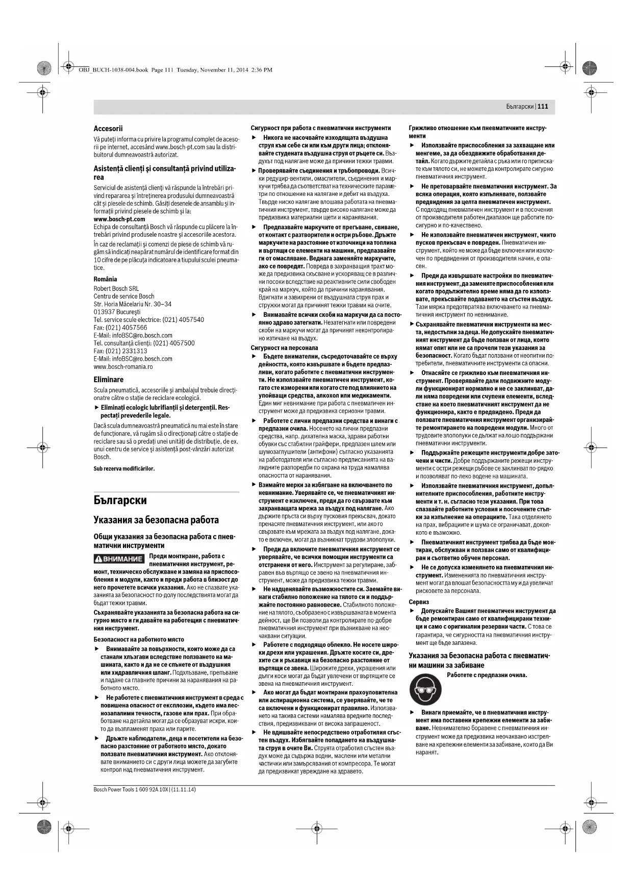 Детайлът трябва да бъде заменен. Мярка Причина Изпълнение OBJ_BUCH-1038-004.book Page 115 Tuesday, November 11, 2014 2:36 PM1 609 92A 10X | (11.11.14) Bosch Power Tools 116 | Македонски Допълнителни приспособления Можете да получите подробна информация за пълната гама висококачествени консумативи и допълнителни приспособления в интернет на адрес www.bosch- pt.com или при Вашия специализиран търговец. Сервиз и технически съвети Отговори на въпросите си относно ремонта и поддръж- ката на Вашия продукт можете да получите от нашия сервизен отдел. Монтажни чертежи и информация за резервни части можете да намерите също на адрес: www.bosch-pt.com Екипът на Бош за технически съвети и приложения ще отговори с удоволствие на въпросите Ви относно наши- те продукти и допълнителните приспособления за тях. Винаги, когато се обръщате към представителите на Бош с въпроси, моля непременно посочвайте 10-ци- френия каталожен номер, изписан на табелката на пневматичния инструмент. Роберт Бош EООД – България Бош Сервиз Център Гаранционни и извънгаранционни ремонти бyл. Черни връx 51-Б FPI Бизнес център 1407 1907 София Тел.: (02) 9601061 Тел.: (02) 9601079 Факс: (02) 9625302 www.bosch.bg