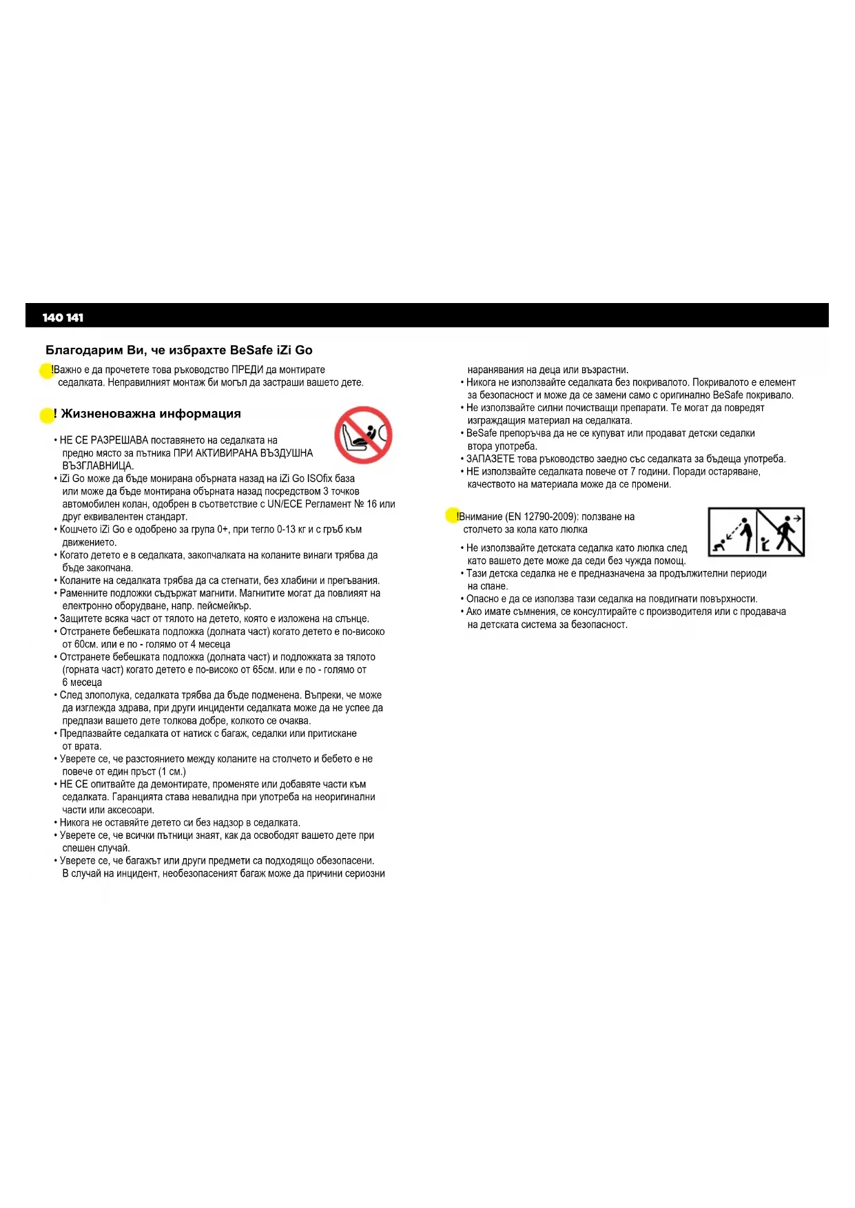 - Уверетесе,чебагажътилидругипредметисаподходящообезопасени. Вслучайнаинцидент,необезопасениятбагажможедапричинисериозни Благодарим Ви, че избрахте BeSafe iZi Go ! ВажноедапрочетететоваръководствоПРЕДИдамонтирате седалката.Неправилниятмонтажбимогълдазастрашивашетодете. ! Внимание(EN12790-2009):ползванена столчетозаколакатолюлка нараняваниянадецаиливъзрастни.