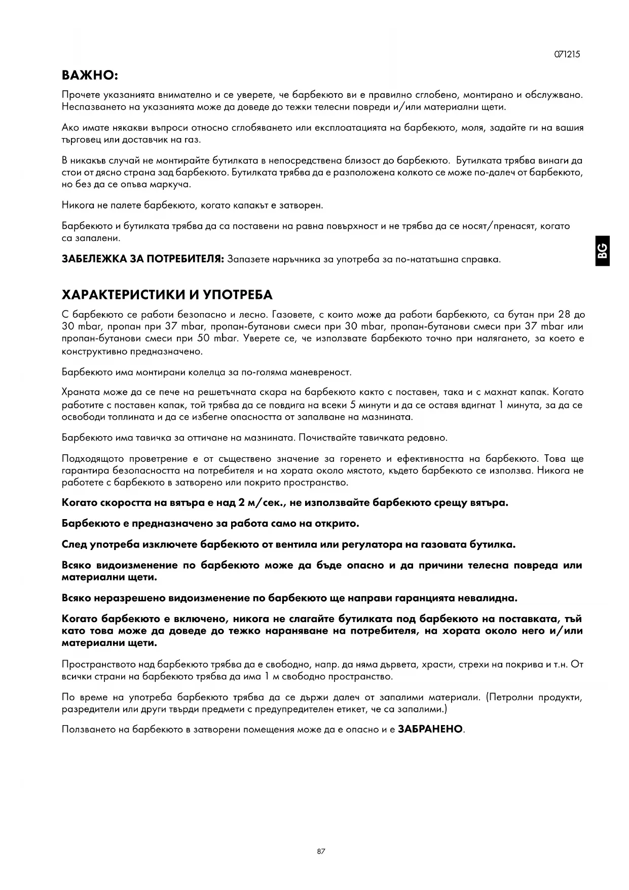 Прочете указанията внимателно и се уверете, че барбекюто ви е правилно сглобено, монтирано и обслужвано. Неспазването на указанията може да доведе до тежки телесни повреди и/или материални щети. Ако имате някакви въпроси относно сглобяването или експлоатацията на барбекюто, моля, задайте ги на вашия търговец или доставчик на газ. В никакъв случай не монтирайте бутилката в непосредствена близост до барбекюто. Бутилката трябва винаги да стои от дясно страна зад барбекюто. Бутилката трябва да е разположена колкото се може по-далеч от барбекюто, но без да се опъва маркуча. Никога не палете барбекюто, когато капакът е затворен. Барбекютоибутилкататрябвадасапоставенинаравнаповърхностинетрябвадасеносят/пренасят,когато са запалени. ЗАБЕЛЕЖКА ЗА ПОТРЕБИТЕЛЯ: Запазете наръчника за употреба за по-нататъшна справка. ХАРАКТЕРИСТИКИ И УПОТРЕБА С барбекюто се работи безопасно и лесно. Газовете, с които може да работи барбекюто, са бутан при 28 до 30 mbar, пропан при 37 mbar, пропан-бутанови смеси при 30 mbar, пропан-бутанови смеси при 37 mbar или пропан-бутанови смеси при 50 mbar. Уверете се, че използвате барбекюто точно при налягането, за което е конструктивно предназначено. Барбекюто има монтирани колелца за по-голяма маневреност. Храната може да се пече на решетъчната скара на барбекюто както с поставен, така и с махнат капак. Когато работите с поставен капак, той трябва да се повдига на всеки 5 минути и да се оставя вдигнат 1 минута, за да се освободи топлината и да се избегне опасността от запалване на мазнината. Барбекюто има тавичка за оттичане на мазнината. Почиствайте тавичката редовно. Подходящото проветрение е от съществено значение за горенето и ефективността на барбекюто. Това ще гарантира безопасността на потребителя и на хората около мястото, където барбекюто се използва. Никога не работете с барбекюто в затворено или покрито пространство. Когато скоростта на вятъра е над 2 м/сек., не използвайте барбекюто срещу вятъра. Барбекюто е предназначено за работа само на открито. След употреба изключете барбекюто от вентила или регулатора на газовата бутилка. Всяко видоизменение по барбекюто може да бъде опасно и да причини телесна повреда или материални щети. Всяко неразрешено видоизменение по барбекюто ще направи гаранцията невалидна. Когато барбекюто е включено, никога не слагайте бутилката под барбекюто на поставката, тъй като това може да доведе до тежко нараняване на потребителя, на хората около него и/или материални щети. Пространството над барбекюто трябва да е свободно, напр. да няма дървета, храсти, стрехи на покрива и т.н. От всички страни на барбекюто трябва да има 1 м свободно пространство. По време на употреба барбекюто трябва да се държи далеч от запалими материали. (Петролни продукти, разредители или други твърди предмети с предупредителен етикет, че са запалими.) Ползването на барбекюто в затворени помещения може да е опасно и е ЗАБРАНЕНО. BG88