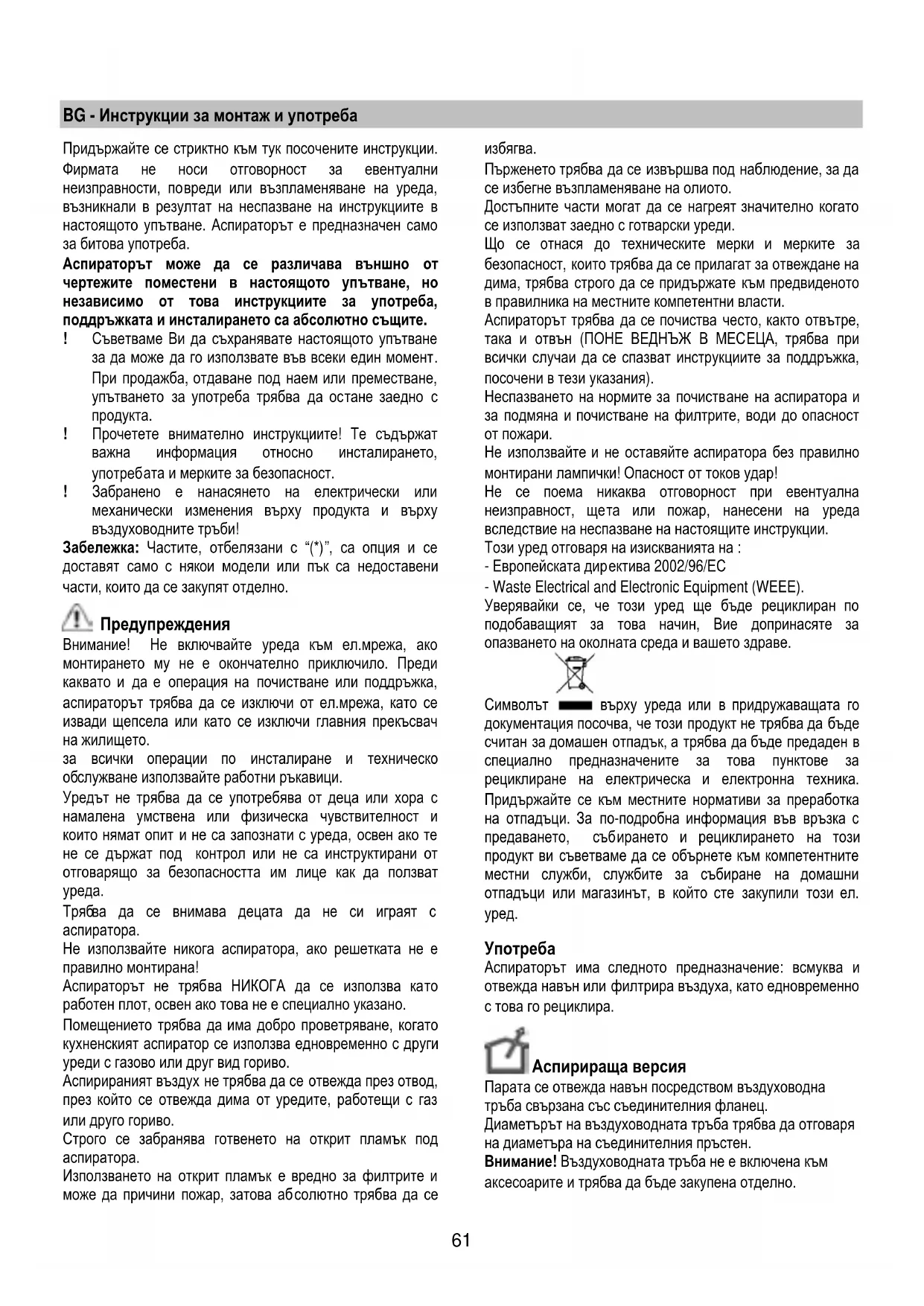 Если система п одсветки не работает, проверьте корректную установку ламп в гнездах, прежде чем обратиться в центр технической помощи.61 BG - Инструкции за монтаж и употреба Придържайте се стриктно към тук посочените инструкции. Фирмата не носи отговорност за евентуални неизправности, повреди или възпламеняване на уреда, възникнали в резултат на неспазване на инструкциите в настоящото упътване. Аспираторът е предназначен само за битова употреба. Аспираторът може да се различава външно от чертежите поместени в настоящото упътване, но независимо от то ва инструкциите за употреба, поддръжката и инсталирането са абсолютно същите. ! Съветваме Ви да съхранявате настоящото упътване за да може да го използвате във всеки един момент. При продажба, отдаване под наем или преместване, упътването за употреба трябва да остане заедно с