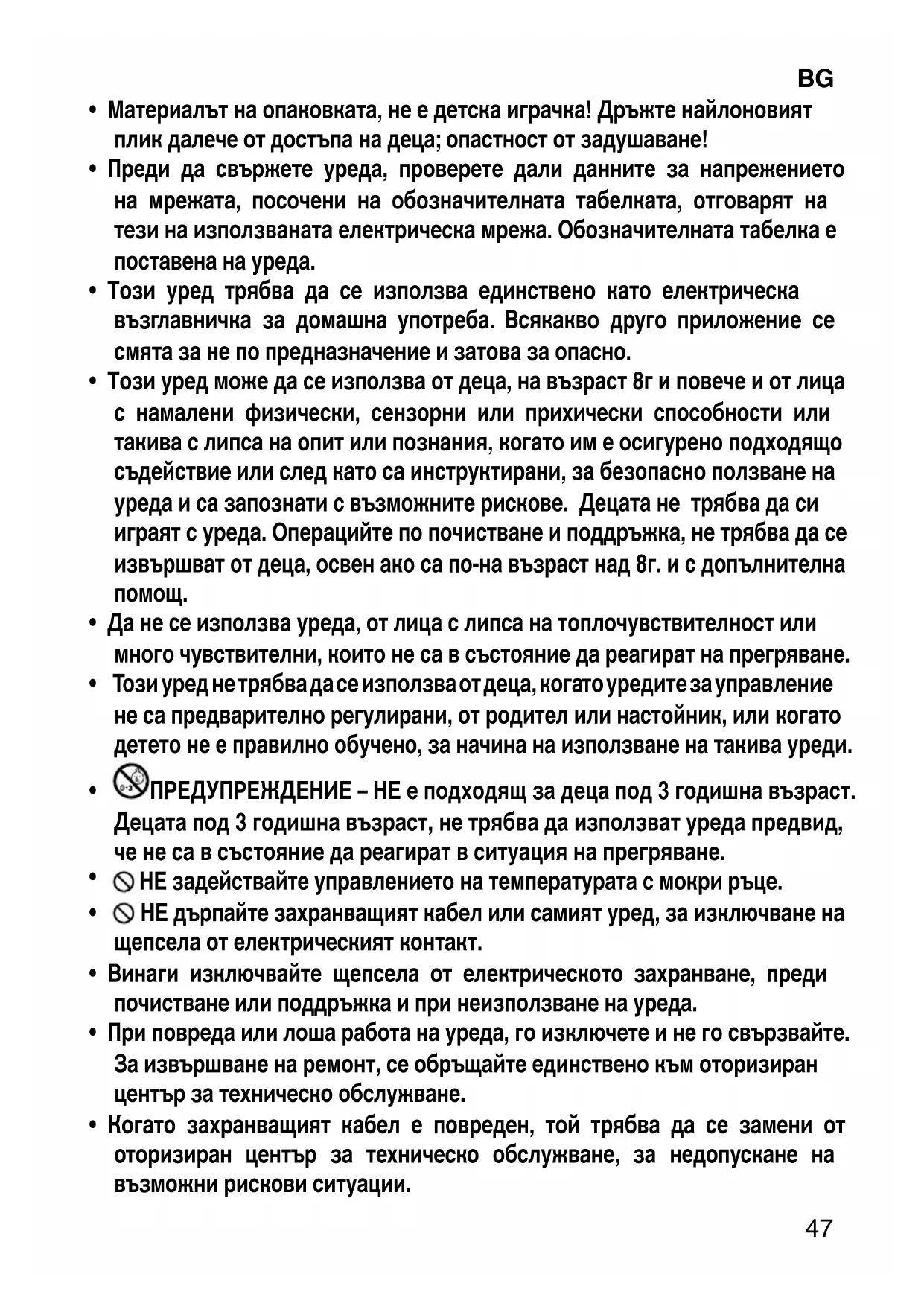 - Този уред може да се използва от деца, на възраст 8г и повече и от лица с намалени физически, сензорни или прихически способности или такива с липса на опит или познания, когато им е осигурено подходящо съдействие или след като са инструктирани, за безопасно ползване на уреда и са запознати с възможните рискове. Децата не трябва да си играят с уреда. Операцийте по почистване и поддръжка, не трябва да се извършват от деца, освен ако са по-на възраст над 8г. и с допълнителна