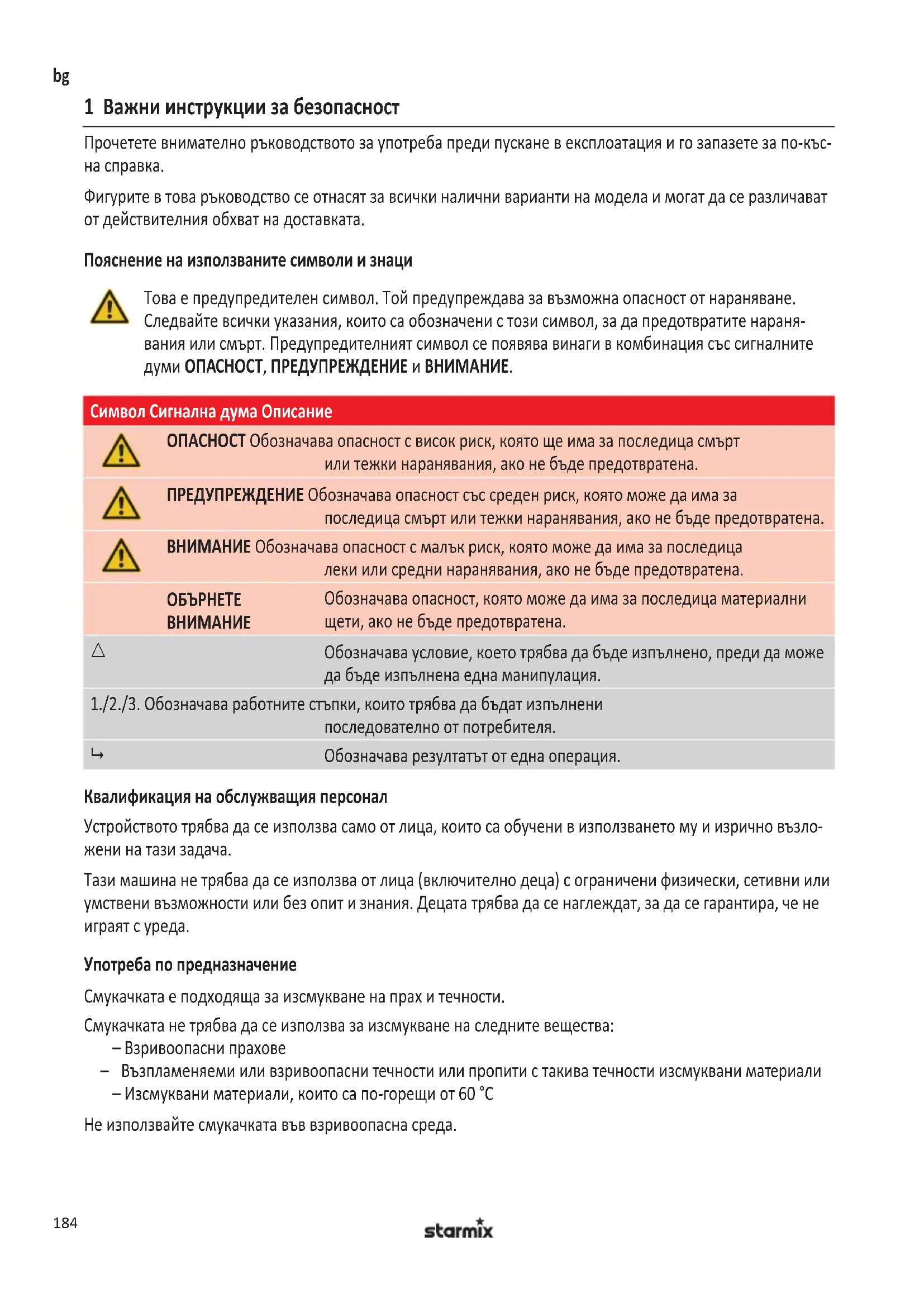 1 Важни инструкции за безопасност Прочетете внимателно ръководството за употреба преди пускане в експлоатация и го запазете за по-къс- на справка. Фигурите в това ръководство се отнасят за всички налични варианти на модела и могат да се различават от действителния обхват на доставката. Пояснение на използваните символи и знаци Това е предупредителен символ. Той предупреждава за възможна опасност от нараняване. Следвайте всички указания, които са обозначени с този символ, за да предотвратите нараня- вания или смърт. Предупредителният символ се появява винаги в комбинация със сигналните думи ОПАСНОСТ, ПРЕДУПРЕЖДЕНИЕ и ВНИМАНИЕ. Символ Сигнална дума Описание ОПАСНОСТ Обозначава опасност с висок риск, която ще има за последица смърт или тежки наранявания, ако не бъде предотвратена. ПРЕДУПРЕЖДЕНИЕ Обозначава опасност със среден риск, която може да има за последица смърт или тежки наранявания, ако не бъде предотвратена. ВНИМАНИЕ Обозначава опасност с малък риск, която може да има за последица леки или средни наранявания, ако не бъде предотвратена.