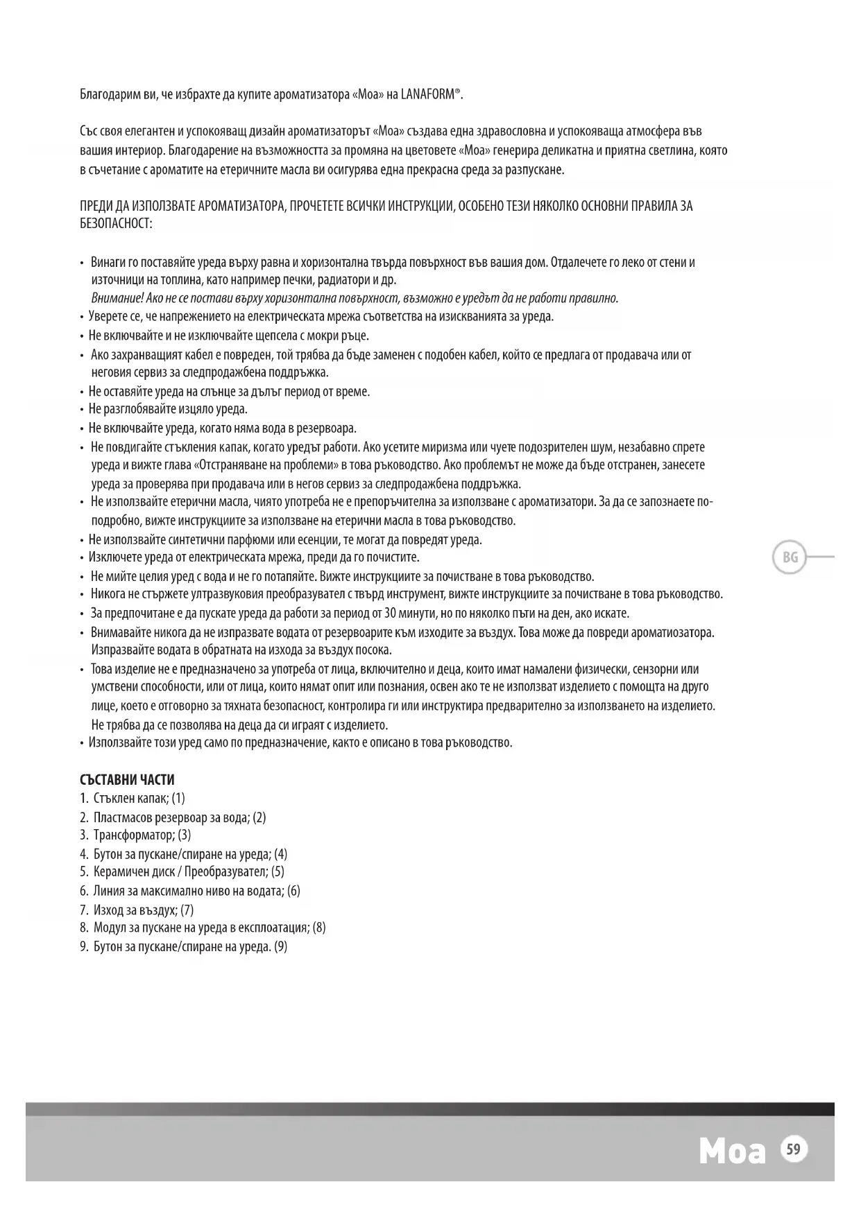 Благодарим ви, че избрахте да купите ароматизатора «Moa» на LANAFORM®. Със своя елегантен и успокояващ дизайн ароматизаторът «Moa» създава една здравословна и успокояваща атмосфера във вашия интериор. Благодарение на възможността за промяна на цветовете «Moa» генерира деликатна и приятна светлина, която в съчетание с ароматите на етеричните масла ви осигурява една прекрасна среда за разпускане. ПРЕДИ ДА ИЗПОЛЗВАТЕ АРОМАТИЗАТОРА, ПРОЧЕТЕТЕ ВСИЧКИ ИНСТРУКЦИИ, ОСОБЕНО ТЕЗИ НЯКОЛКО ОСНОВНИ ПРАВИЛА ЗА БЕЗОПАСНОСТ: