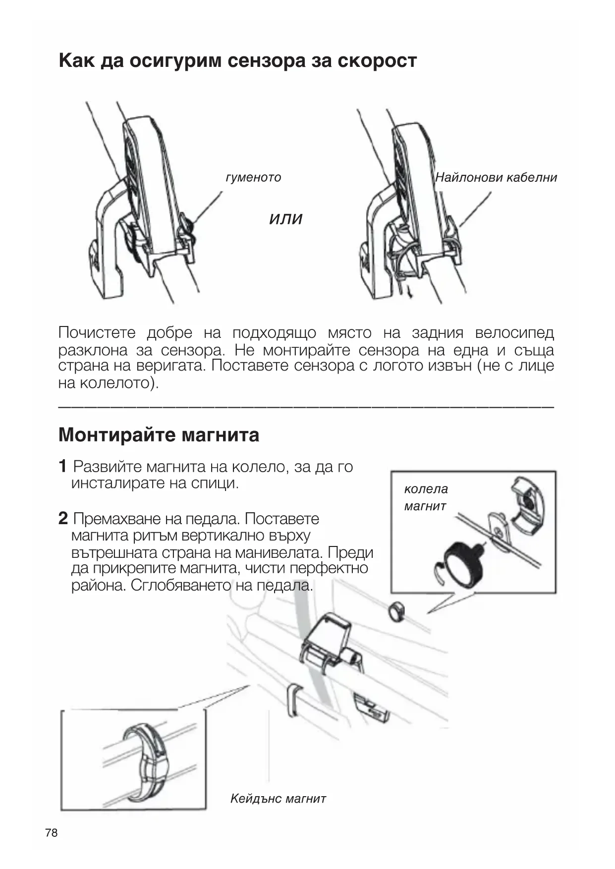 Как да монтирате сензора скорост и магнит сензор Speed Кейдънс магнит колела магнит отвертка Nylon кабел гуменото Кейдънс сензор сензор Speed колела магнит Кейдънс магнит78 Как да осигурим сензора за скорост Почистете добре на подходящо място на задния велосипед разклона за сензора. Не монтирайте сензора на една и съща страна на веригата. Поставете сензора с логото извън (не с лице на колелото).