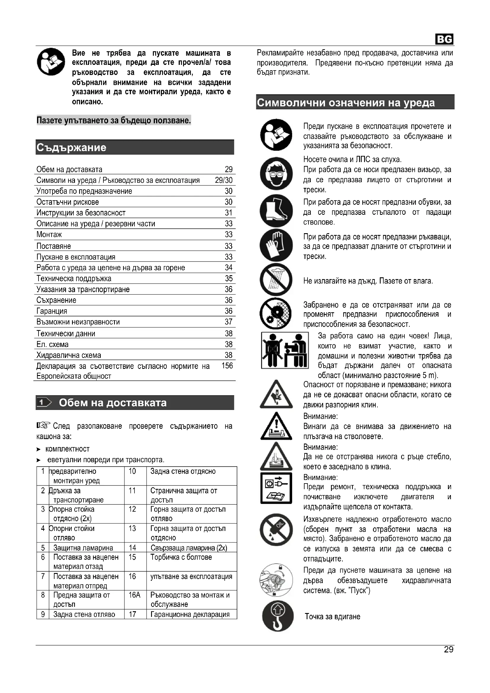 Обем на доставката 29 Символи на уреда / Ръководство за експлоатация 29/30 Употреба по предназначение 30 Остатъчни рискове 30 Инструкции за безопасност 31 Описание на уреда / резервни части 33 Монтаж 33 Поставяне 33 Пускане в експлоатация 33 Работа с уреда за цепене на дърва за горене 34 Техническа поддръжка 35 Указания за транспортиране 36 Съхранение 36 Гаранция 36 Възможни неизправности 37 Технически данни 38 Ел. схема 38 Хидравлична схема 38 Декларация за съответствие съгласно нормите на Европейската общност