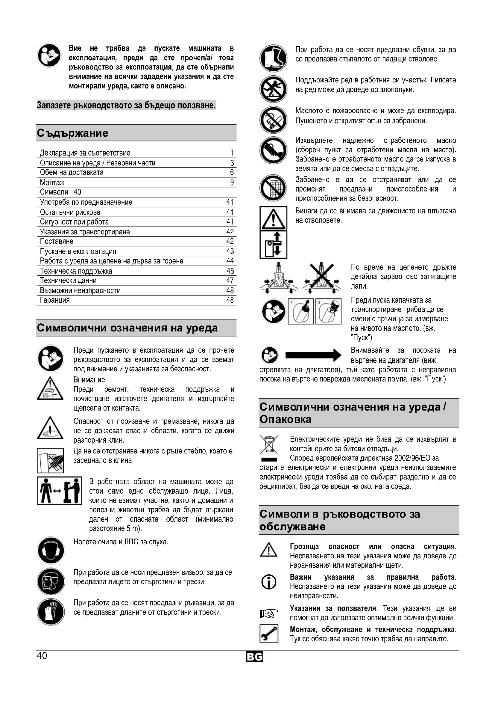Декларация за съответствие 1 Описание на уреда / Резервни части 3 Обем на доставката 6 Монтаж 9 Символи 40 Употреба по предназначение 41 Остатъчни рискове 41 Сигурност при работа 41 Указания за транспортиране 42 Поставяне 42 Пускане в експлоатация 43 Работа с уреда за цепене на дърва за горене 44 Техническа поддръжка 46 Технически данни 47 Възможни неизправности 48 Гаранция 48