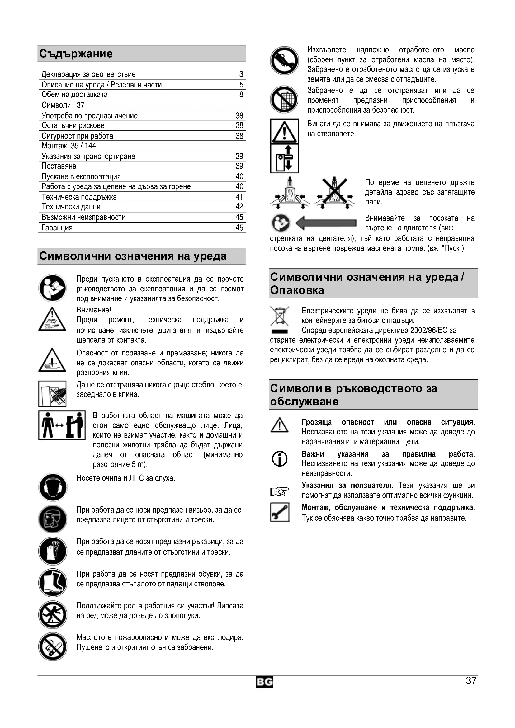 Декларация за съответствие 3 Описание на уреда / Резервни части 5 Обем на доставката 8 Символи 37 Употреба по предназначение 38 Остатъчни рискове 38 Сигурност при работа 38 Монтаж 39 / 144 Указания за транспортиране 39 Поставяне 39 Пускане в експлоатация 40 Работа с уреда за цепене на дърва за горене 40 Техническа поддръжка 41 Технически данни 42 Възможни неизправности 45 Гаранция 45
