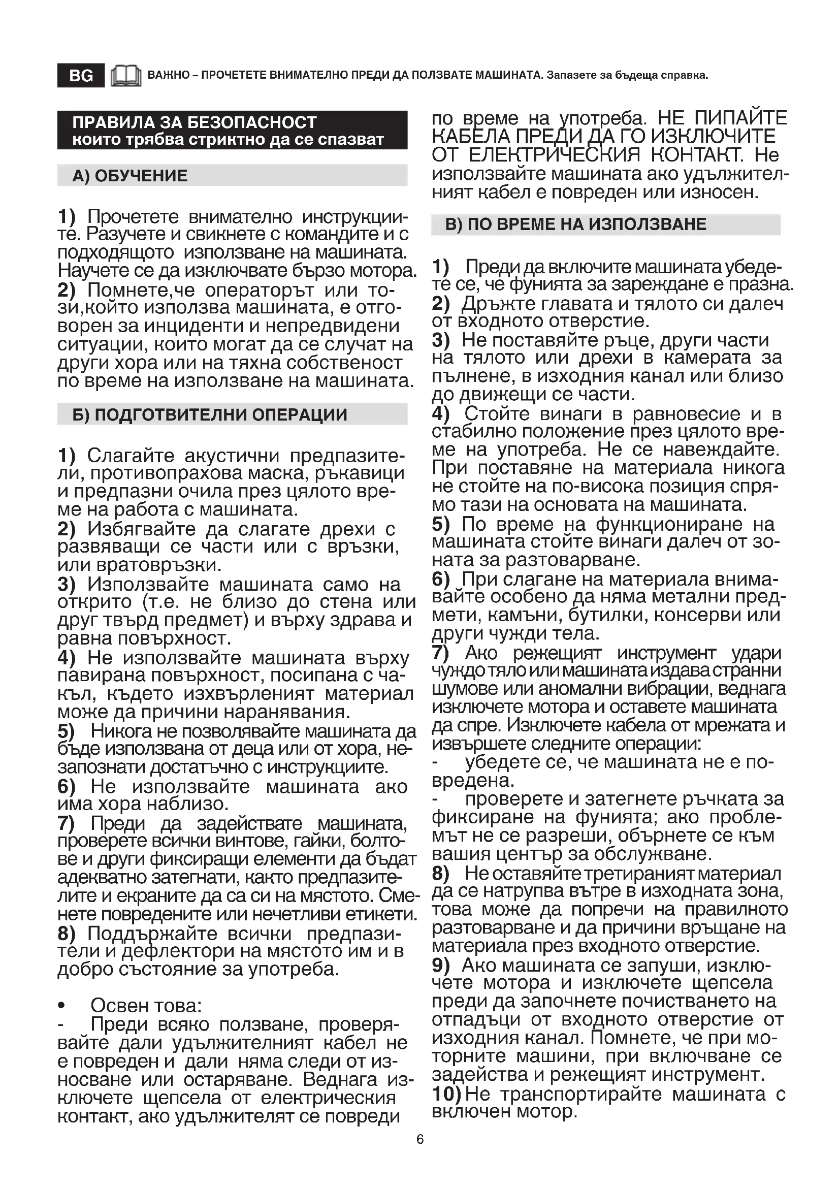чете мотора и изключете щепсела преди да започнете почистването на отпадъци от входното отверстие от изходния канал. Помнете, че при мо- торните машини, при включване се задейства и режещият инструмент.