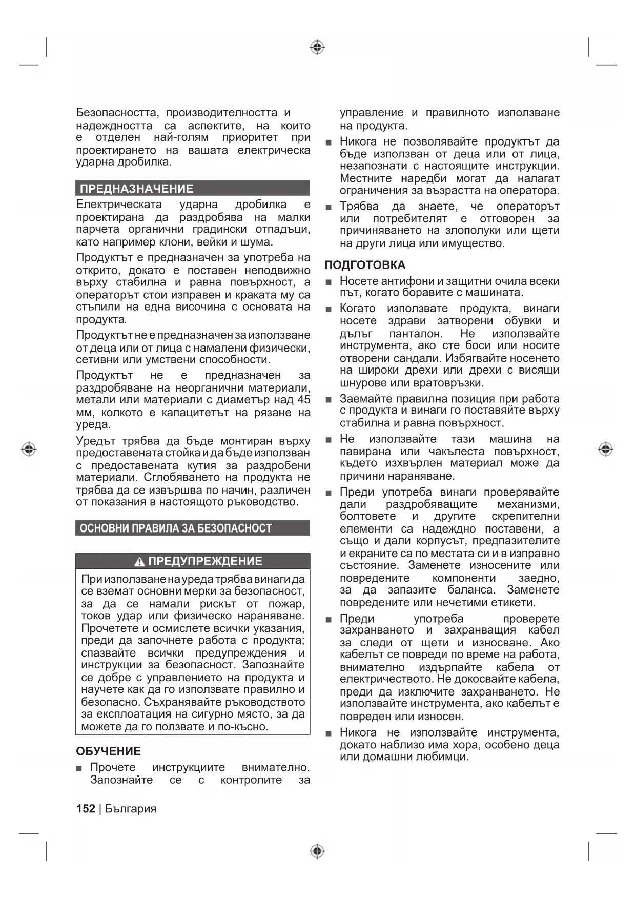Продуктът не е предназначен за използване от деца или от лица с намалени физически, сетивни или умствени способности. Продуктът не е предназначен за раздробяване на неорганични материали, метали или материали с диаметър над 45 мм, колкото е капацитетът на рязане на