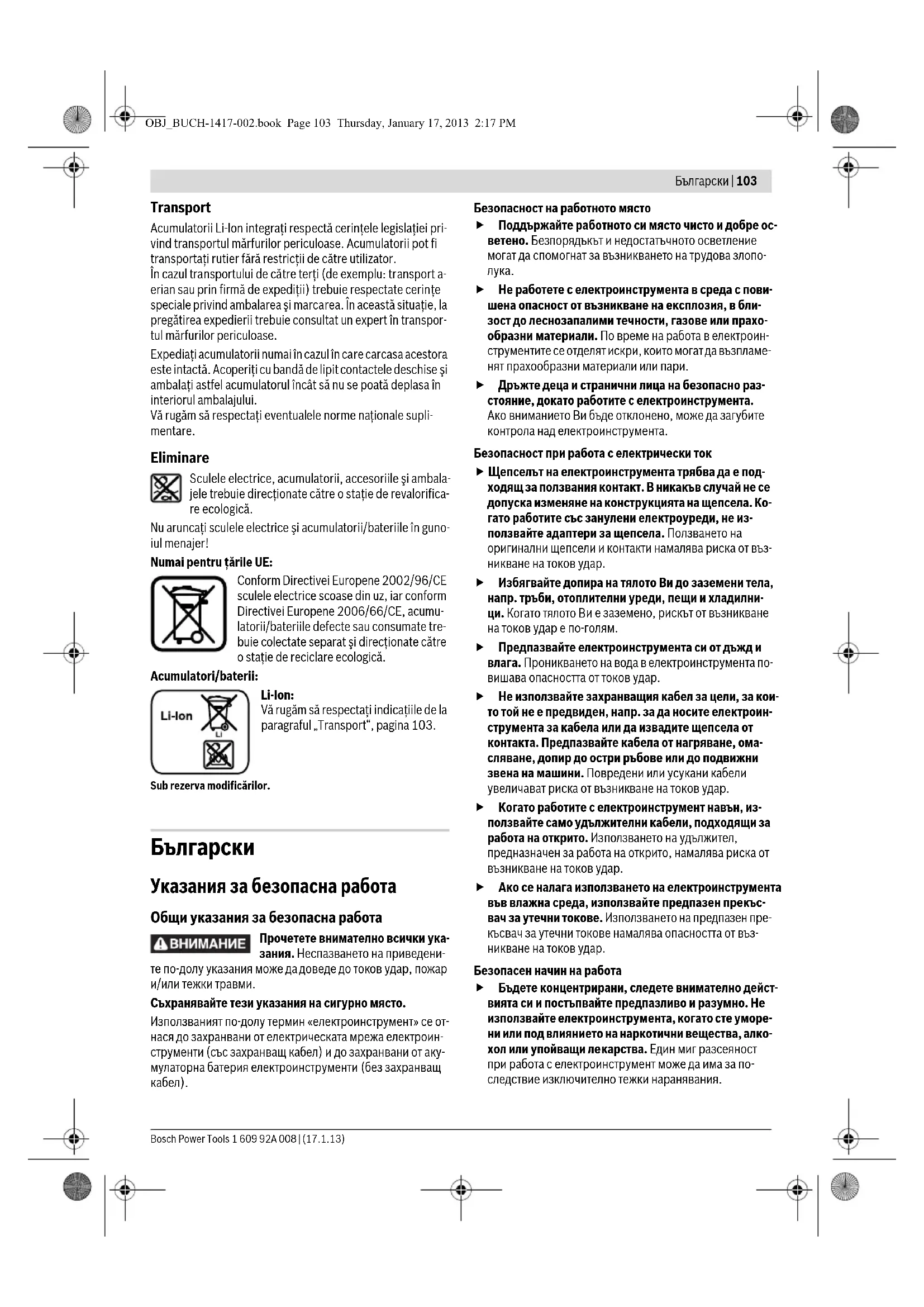 –Настройте предпаз ната пластина 3 съобразно дебели- ната на разрязвания детайл и отново затегнете винта с накатена глава 1. Работа с електроинструмента Преди да извършвате каквито и да е дейности по електроинструмента (напр. техническо обслужва- не, смяна на работния инструмент и т.н.), когато го транспортирате или съхранявате, демонтирайте акумулаторната батерия. Съществува опасност от на- раняване при задействане на пусковия прекъсвач по невнимание. Dr. Egbert Schneider Senior Vice President Engineering Helmut Heinzelmann Head of Product Certification PT/ETM9 Светодиод Капацитет Непрекъснато светене 3 х зелено ≥ 2/3 Непрекъснато светене 2 х зелено ≥ 1/3 Непрекъснато светене 1 х зелено <1/3 Мигаща светлина 1 x зелена резерва OBJ_BUCH-1417-002.book Page 106 Thursday, January 17, 2013 2:17 PMБългарски | 107 Bosch Power Tools 1 609 92A 008 | (17.1.13) Пускане в експлоатация Поставяне на акумулаторната батерия Използвайте само оригинални литиево-йонни бате- рии, производство на Бош, с посоченото на табелка- та на Вашия електроинструмент номинално напре- жение. Използването на други акумулаторни батерии може да предизвика травми и опасност от пожар. Упътване: Използването на акумулаторни батерии, които не са предназначени за Вашия електроинструмент, може да предизвика неправилното му функциониране или да го