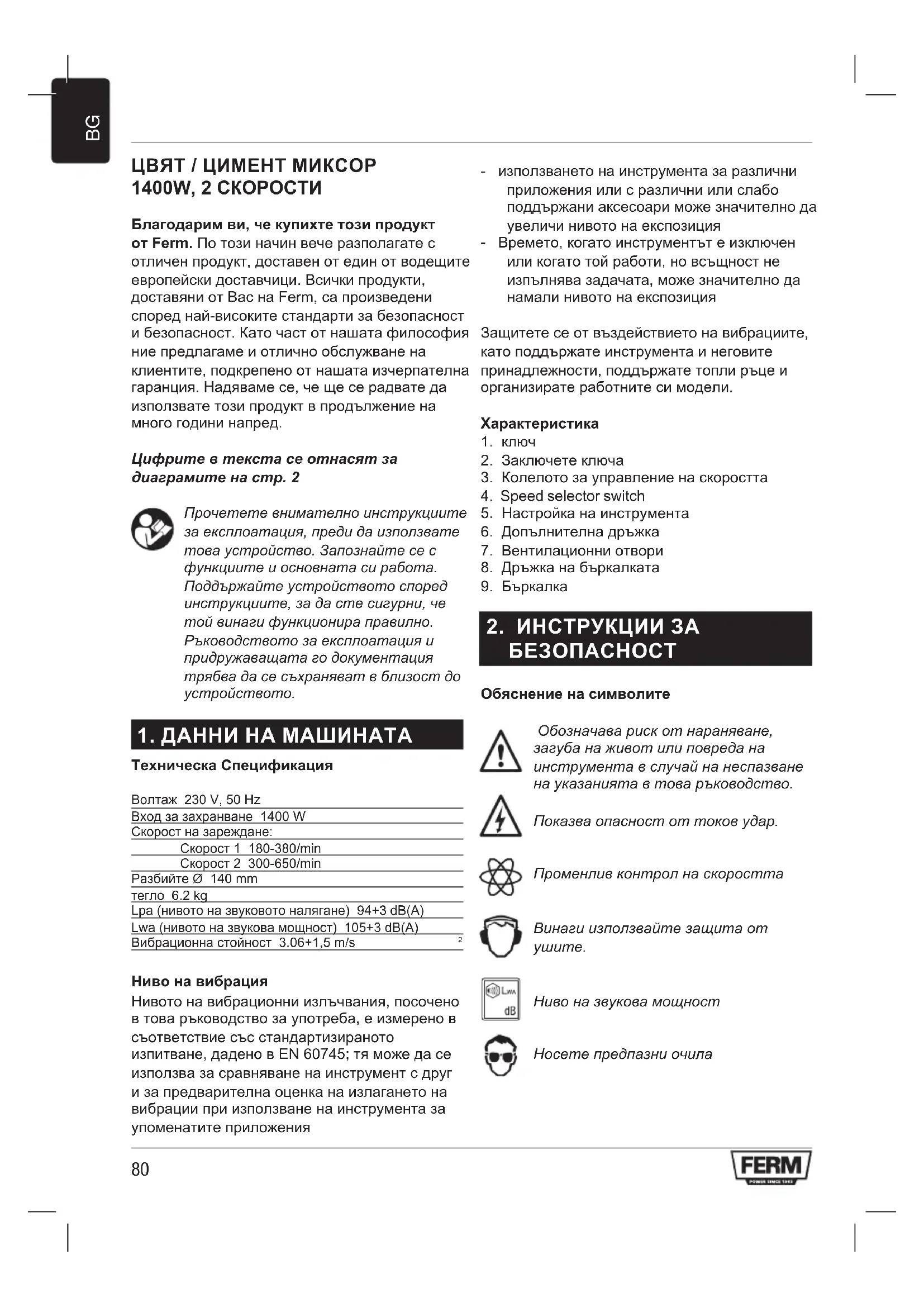 ЦВЯТ / ЦИМЕНТ МИКСОР 1400W, 2 СКОРОСТИ Благодарим ви, че купихте този продукт от Ferm. По този начин вече разполагате с отличен продукт, доставен от един от водещите европейски доставчици. Всички продукти, доставяни от Вас на Ferm, са произведени според найвисоките стандарти за безопасност и безопасност. Като част от нашата философия ние предлагаме и отлично обслужване на клиентите, подкрепено от нашата изчерпателна гаранция. Надяваме се, че ще се радвате да използвате този продукт в продължение на много години напред. Цифрите в текста се отнасят за диаграмите на стр. 2 Прочететевнимателноинструкциите заексплоатация,предидаизползвате товаустройство.Запознайтесес функциитеиосновнатасиработа. Поддържайтеустройствотоспоред инструкциите,задастесигурни,че тойвинагифункционираправилно. Ръководствотозаексплоатацияи придружаващатагодокументация трябвадасесъхраняватвблизостдо устройството.