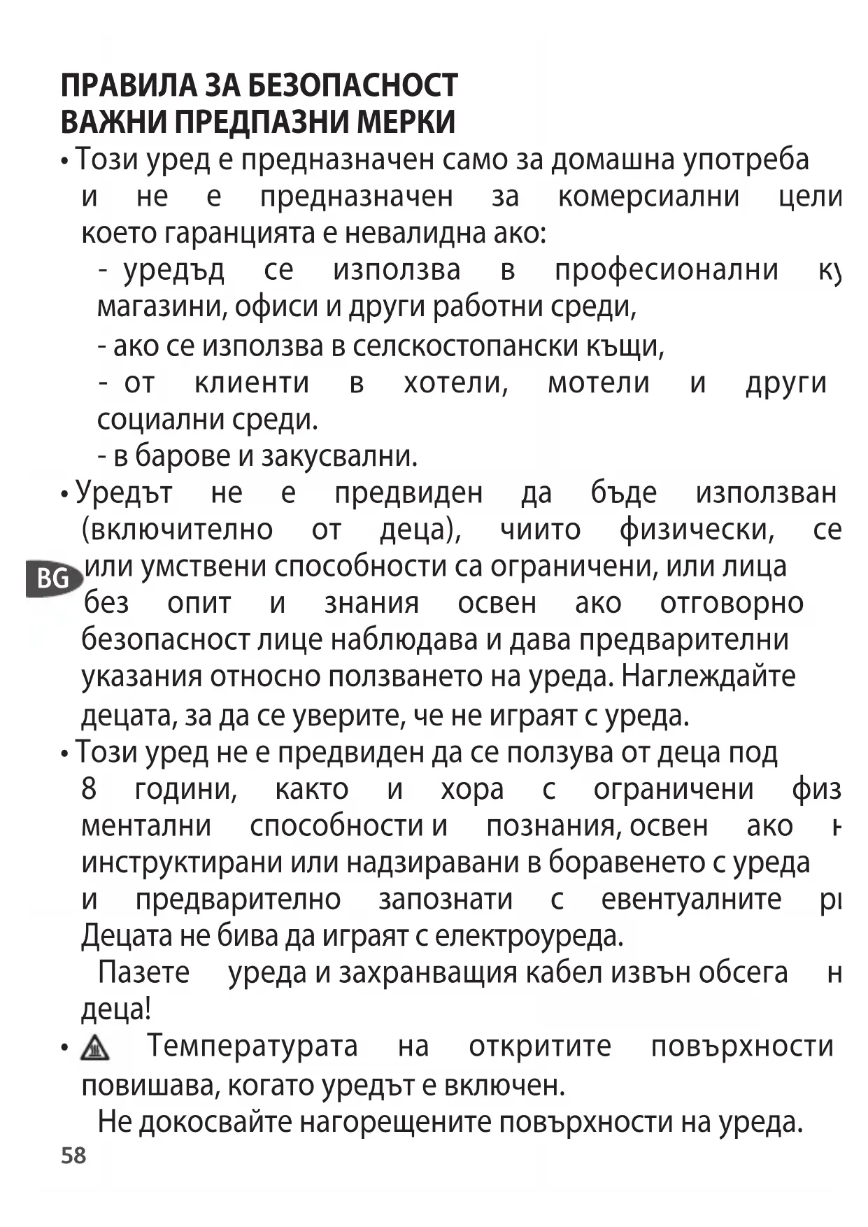 - Тозиуредепредназначенсамозадомашнаупотреба и не е предназначен за комерсиални цели, поради коетогаранциятаеневалиднаако: -уредъд се използва в професионални кухни в магазини,офисиидругиработнисреди, -акосеизползвавселскостопанскикъщи, -от клиенти в хотели, мотели и други подобни социалнисреди. -вбаровеизакусвални.
