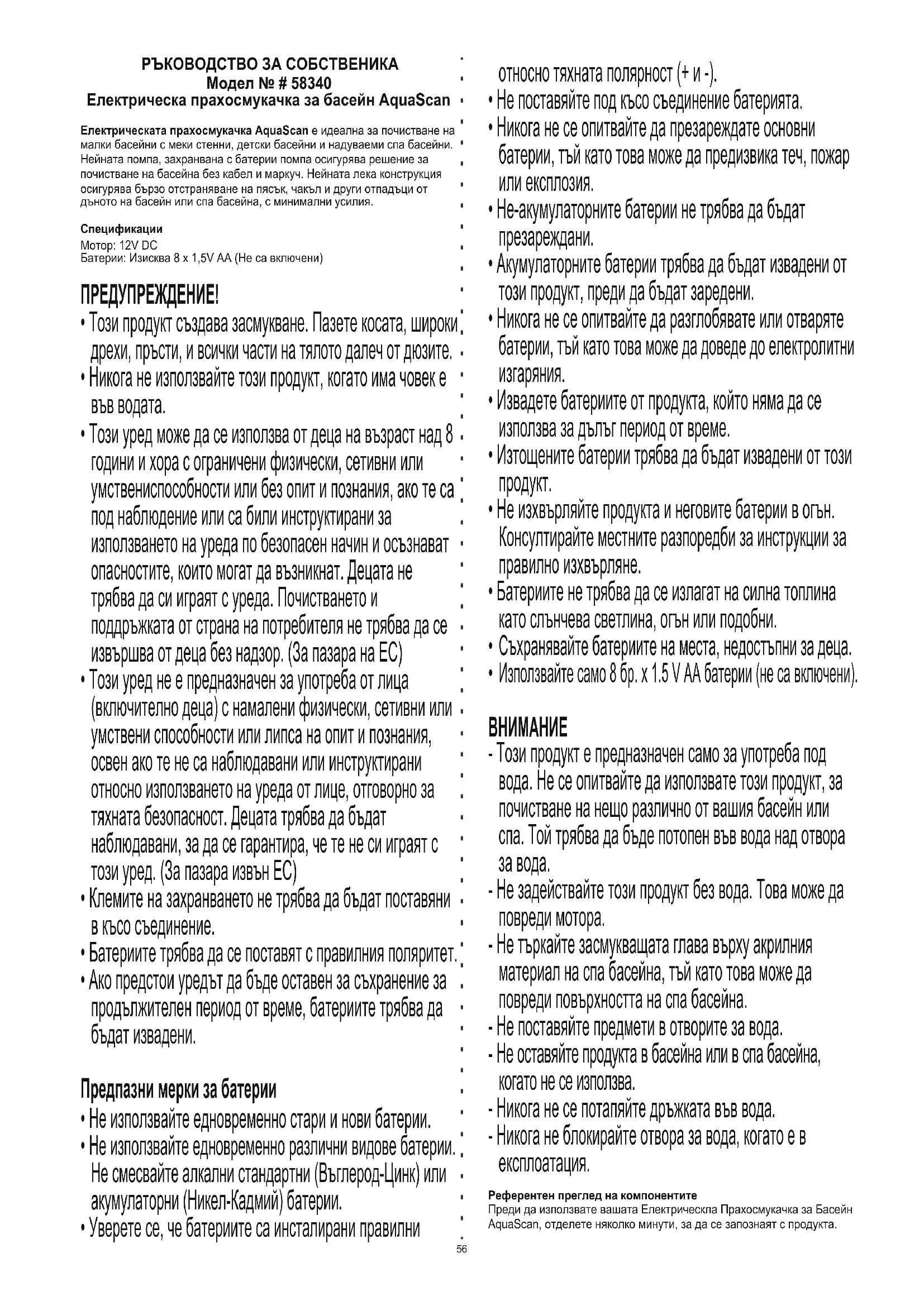 prefiltrare înapoi sub protecție, iar apoi protecția pe trunchi. Asigurați-vă că blocatorii din interiorul protecției (2 părți) sunt fixați în canelura trunchiului, înainte de următoarea utilizare (Fig. 6). Fig.5 Fig.4Fig.4 Fig.6 Fig.656 РЪКОВОДСТВО ЗА СОБСТВЕНИКА Модел № # 58340 Електрическа прахосмукачка за басейн AquaScan Електрическата прахосмукачка AquaScan е идеална за почистване на малки басейни с меки стенни, детски басейни и надуваеми спа басейни. Нейната помпа, захранвана с батерии помпа осигурява решение за почистване на басейна без кабел и маркуч. Нейната лека конструкция осигурява бързо отстраняване на пясък, чакъл и други отпадъци от дъното на басейн или спа басейна, с минимални усилия. Спецификации Мотор: 12V DC Батерии: Изисква 8 х 1,5V AA (Не са включени) ПРЕДУПРЕЖДЕНИЕ!