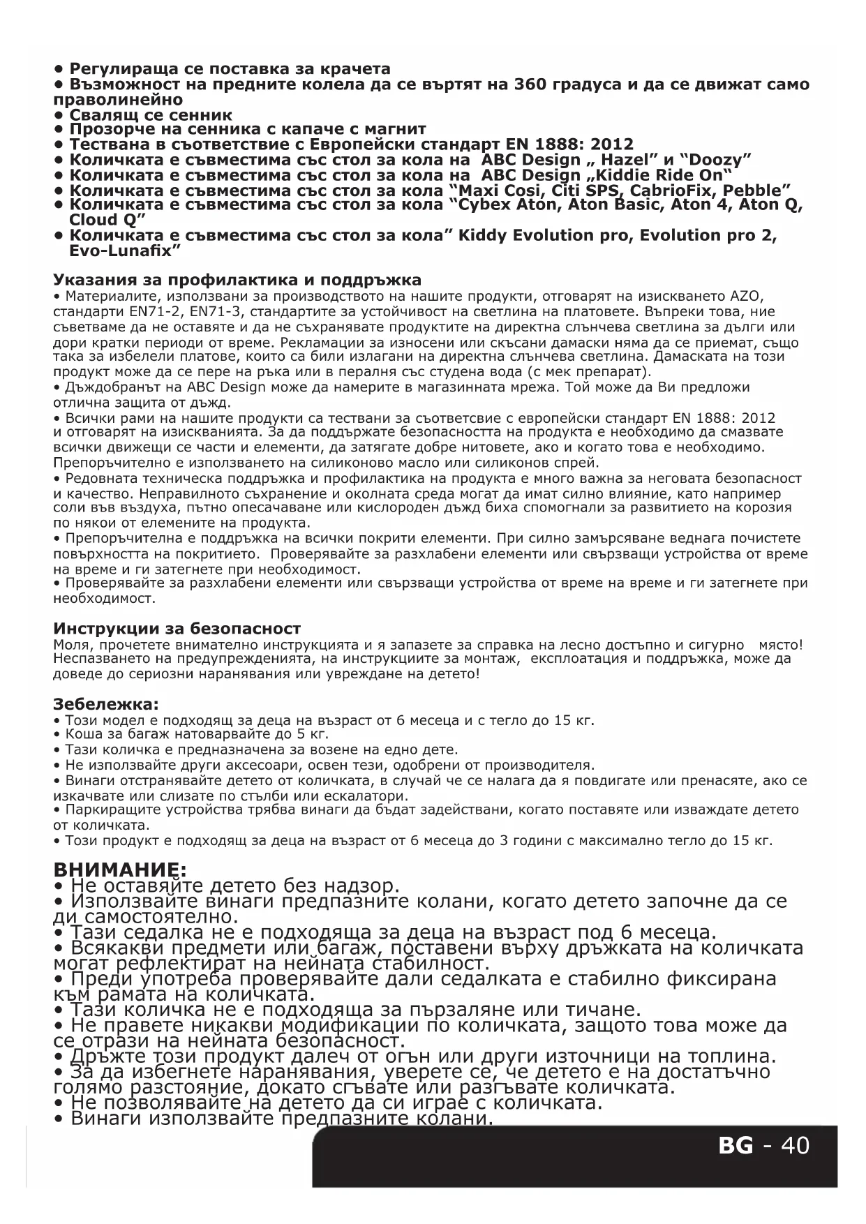 - Количката е съвместима със стол за кола” Kiddy Evolution pro, Evolution pro 2, Evo-Lunax” Указания за профилактика и поддръжка