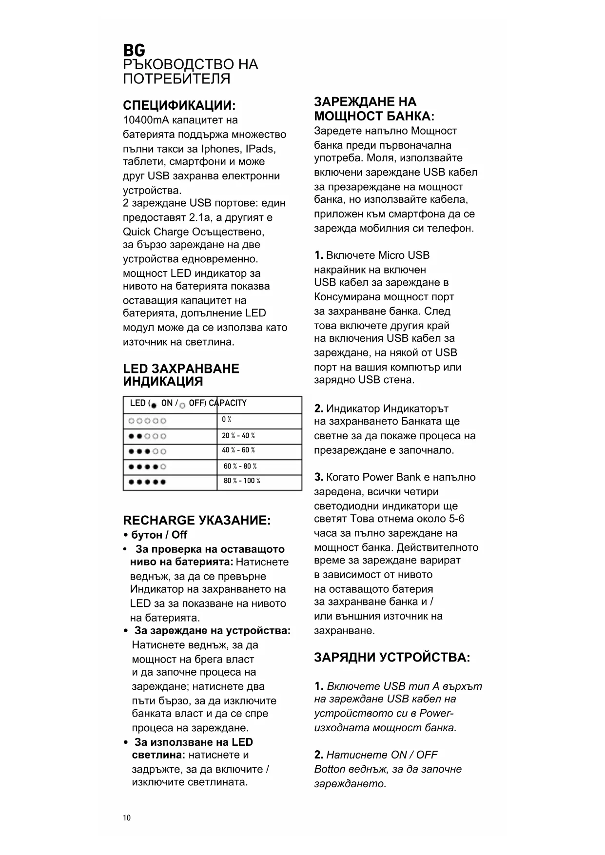 РЪКОВОДСТВО НА ПОТРЕБИТЕЛЯ СПЕЦИФИКАЦИИ: 10400mA капацитет на батерията поддържа множество пълни такси за Iphones, IPads, таблети, смартфони и може друг USB захранва електронни устройства. 2 зареждане USB портове: един предоставят 2.1а, а другият е Quick Charge Осъществено, за бързо зареждане на две устройства едновременно. мощност LED индикатор за нивото на батерията показва оставащия капацитет на батерията, допълнение LED модул може да се използва като източник на светлина. LED ЗАХРАНВАНЕ