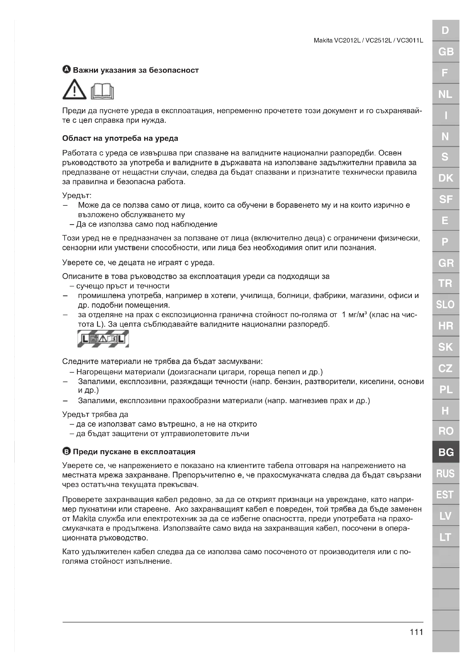 РЪКОВОДСТВО ЗА ПОТРЕБИТЕЛЯ VC2012L MAKITA