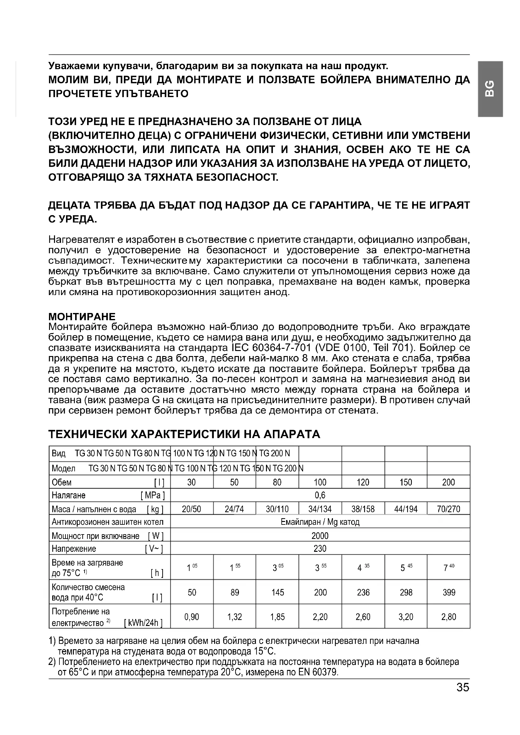 Монтирайте бойлера възможно най-близо до водопроводните тръби. Ако вграждате бойлер в помещение, където се намира вана или душ, е необходимо задължително да спазвате изискванията на стандарта IEC 60364-7-701 (VDE 0100, Teil 701). Бойлер се прикрепва на стена с два болта, дебели най-малко 8 мм. Ако стената е слаба, трябва да я укрепите на мястото, където искате да поставите бойлера. Бойлерът трябва да се поставя само вертикално. За по-лесен контрол и замяна на магнезиевия анод ви препоръчваме да оставите достатъчно място между горната страна на бойлера и тавана (виж размера G на скицата на присъединителните размери). В противен случай при сервизен ремонт бойлерът трябва да се демонтира от стената. ТЕХНИЧЕСКИ ХАРАКТЕРИСТИКИ НА АПАРАТА Вид TG 30 N TG 50 N TG 80 N TG 100 N TG 120 N TG 150 N TG 200 N Модел TG 30 N TG 50 N TG 80 N TG 100 N TG 120 N TG 150 N TG 200 N Обем [ l ] 30 50 80 100 120 150 200 Налягане [ MPa ] 0,6 Маса / напълнен с вода [ kg ] 20/50 24/74 30/110 34/134 38/158 44/194 70/270 Антикорозионен зашитен котел Емайлиран / Мg катод Мощност при включване [ W ] 2000 Напрежение [ V~ ] 230 Време на загряване до 75°C