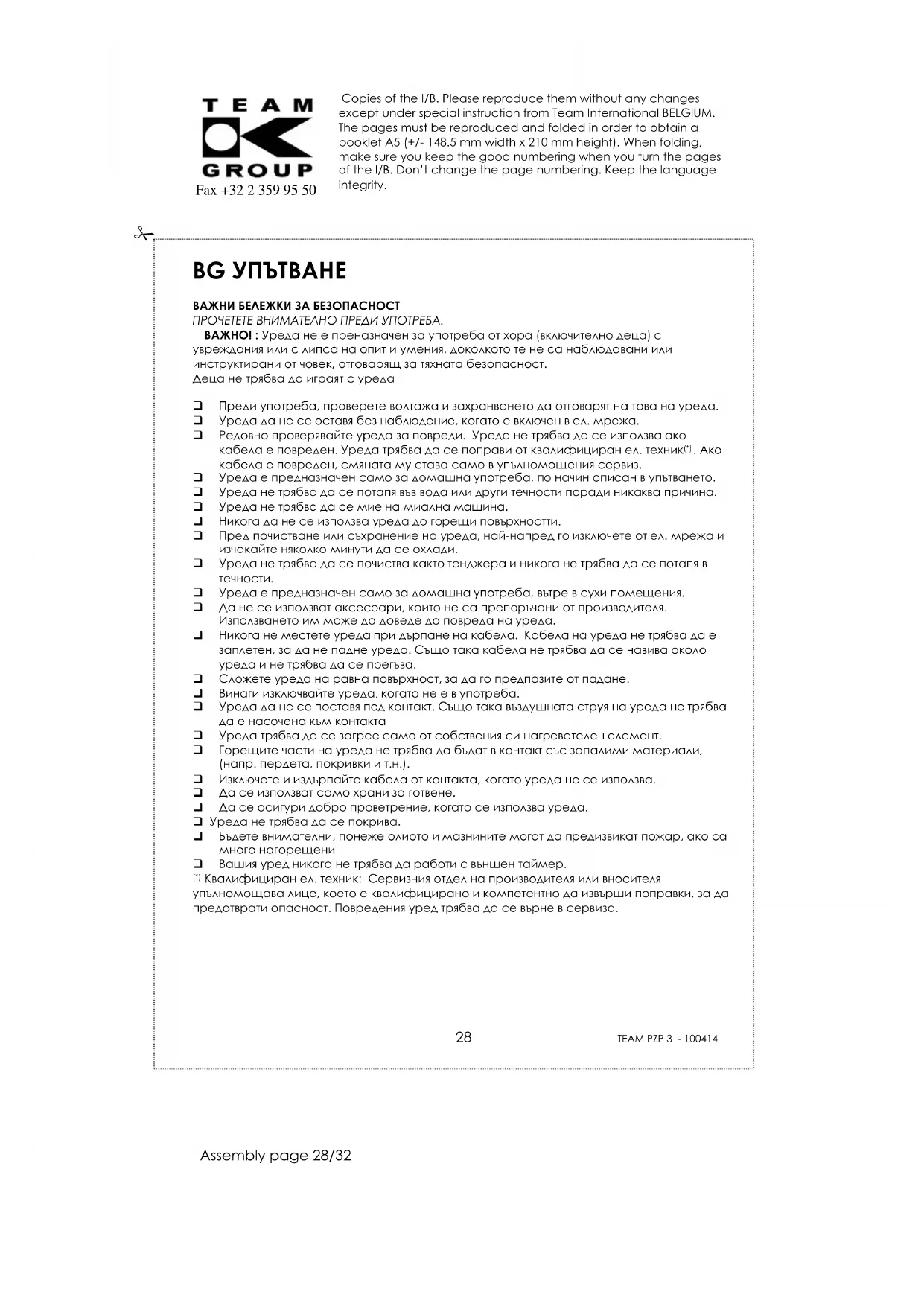 Уреда е предназначен само за домашна употреба, вътре в сухи помещения. Да не се използват аксесоари, които не са препоръчани от производителя. Използването им може да доведе до повреда на уреда. Никога не местете уреда при дърпане на кабела. Кабела на уреда не трябва да е заплетен, за да не падне уреда. Също така кабела не трябва да се навива около уреда и не трябва да се прегъва. Сложете уреда на равна повърхност, за да го предпазите от падане. Винаги изключвайте уреда, когато не е в употреба. Уреда да не се поставя под контакт. Също така въздушната струя на уреда не трябва да е насочена към контакта Уреда трябва да се загрее само от собствения си нагревателен елемент. Горещите части на уреда не трябва да бъдат в контакт със запалими материали, (напр. пердета, покривки и т.н.). Изключете и издърпайте кабела от контакта, когато уреда не се използва. Да се използват само храни за готвене. Да се осигури добро проветрение, когато се използва уреда. Уреда не трябва да се покрива. Бъдете внимателни, понеже олиото и мазнините могат да предизвикат пожар, ако са много нагорещени Вашия уред никога не трябва да работи с външен таймер. Квалифициран ел. техник: Сервизния отдел на производителя или вносителя упълномощава лице, което е квалифицирано и компетентно да извърши поправки, за да предотврати опасност. Повредения уред трябва да се върне в сервиза.Copies of the I/B. Please reproduce them without any changes except under special instruction from Team International BELGIUM. The pages must be reproduced and folded in order to obtain a booklet A5 (+/- 148.5 mm width x 210 mm height). When folding, make sure you keep the good numbering when you turn the pages of the I/B. Don’t change the page numbering. Keep the language integrity.