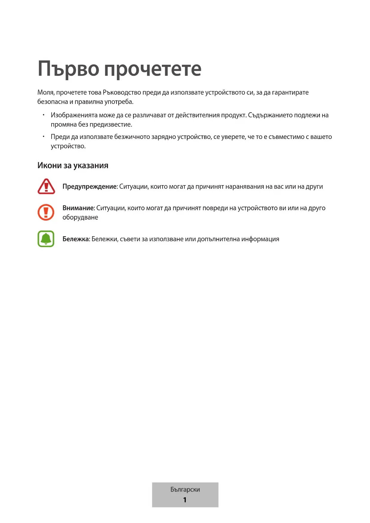 Преди да използвате безжичното зарядно устройство, се уверете, че то е съвместимо с вашето устройство. Икони за указания Предупреждение: Ситуации, които могат да причинят наранявания на вас или на други Внимание: Ситуации, които могат да причинят повреди на устройството ви или на друго