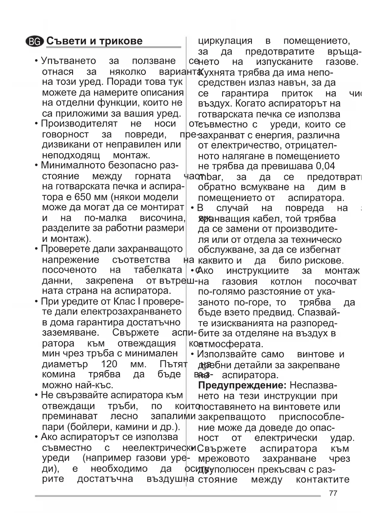- Акоаспираторътсеизползва съвместно с неелектрически уреди (например газови уре- ди), е необходимо да осигу- рите достатъчна въздушна циркулация в помещението, за да предотвратите връща- нето на изпусканите газове. Кухнятатрябвадаиманепо- средственизлазнавън,зада се гарантира приток на чист въздух.Когатоаспираторътна готварскатапечкасеизползва съвместно с уреди, които се захранватсенергия,различна отелектричество,отрицател- нотоналяганевпомещението нетрябвадапревишава0,04 mbar, за да се предотврати обратно всмукване на дим в помещениетоот аспиратора.
