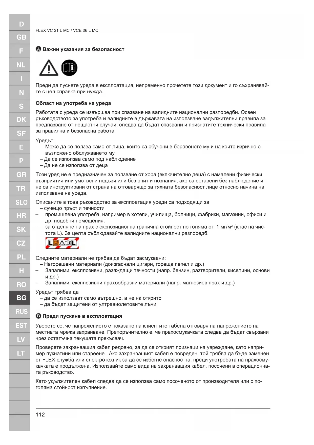 Преди пускане в експлоатация Уверете се, че напрежението е показано на клиентите табела отговаря на напрежението на местната мрежа захранване. Препоръчително е, че прахосмукачката следва да бъдат свързани чрез остатъчна текущата прекъсвач. Проверете захранващия кабел редовно, за да се открият признаци на увреждане, като напри- мер пукнатини или стареене. Ако захранващият кабел е повреден, той трябва да бъде заменен от FLEX служба или електротехник за да се избегне опасността, преди употребата на прахосму- качката е продължена. Използвайте само вида на захранващия кабел, посочени в операционна- та ръководство. Като удължителен кабел следва да се използва само посоченото от производителя или с по- голяма стойност изпълнение.D