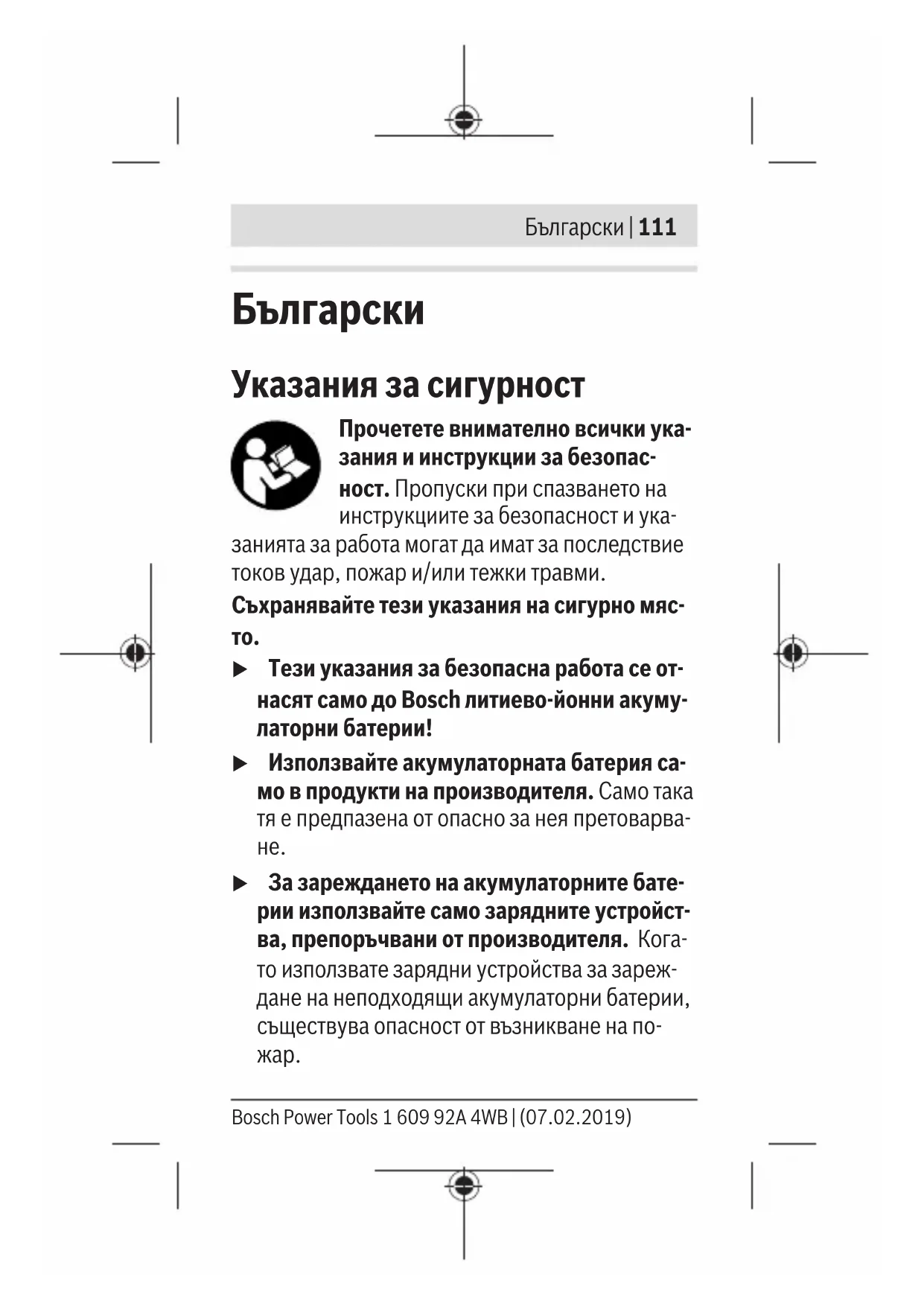 Bosch Power Tools 1 609 92A 4WB | (07.02.2019)112 | Български u Акумулаторната батерия се доставя час- тично заредена. За да достигнете пълния ка- пацитет на акумулаторната батерия, преди първото й използване я заредете докрай в за- рядното устройство. u Когато не използвате акумулаторните ба- терии, ги съхранявайте на недостъпно за деца място. u Не отваряйте акумулаторната батерия. Съ- ществува опасност от възникване на късо съ-