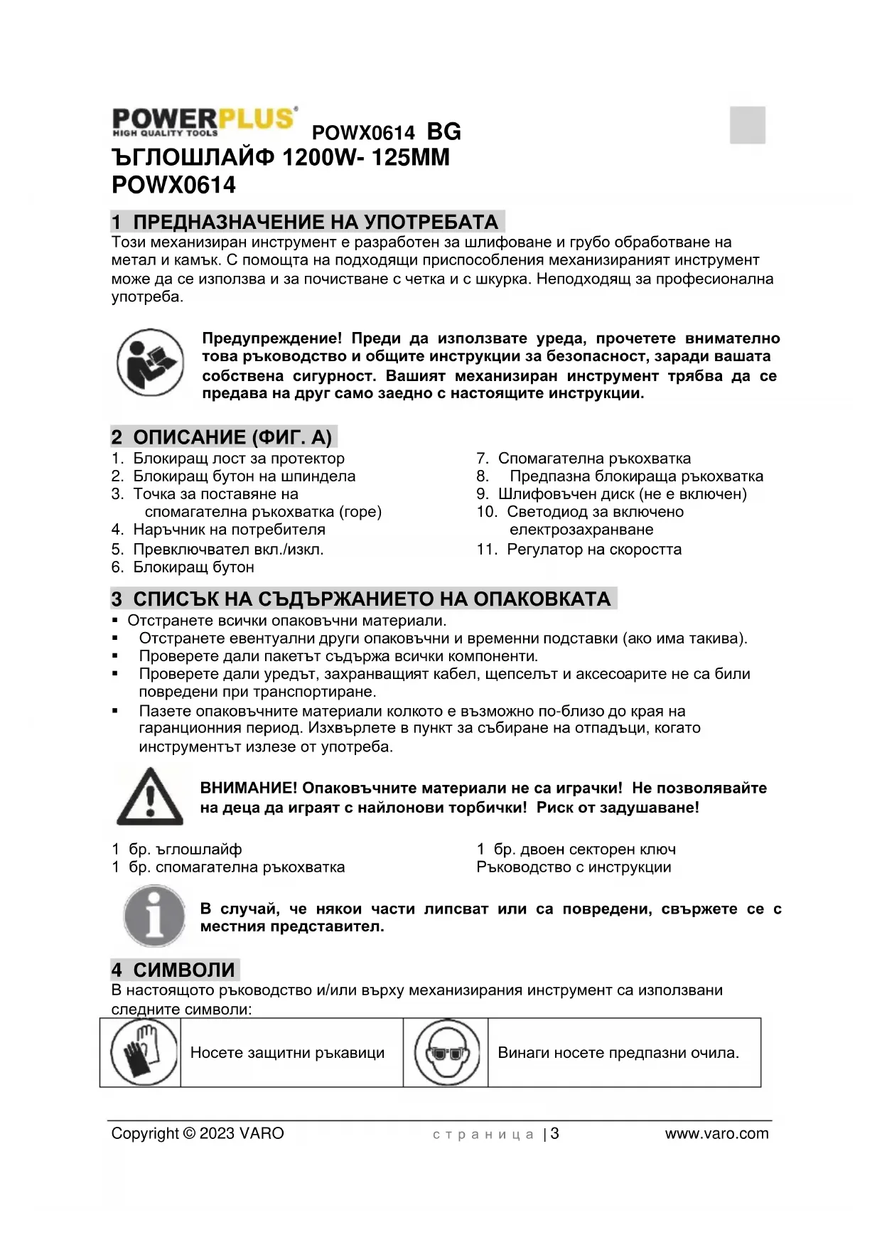 - Осигурете сервизно обслужване на вашия механизиран инструмент само от квалифициран техник, който използва само стандартни резервни части. Това ще гарантира поддържането на задължителните стандарти за безопасност.POWX0614 BG Copyright © 2023 VARO с т р а н и ц а | 6 www.varo.com