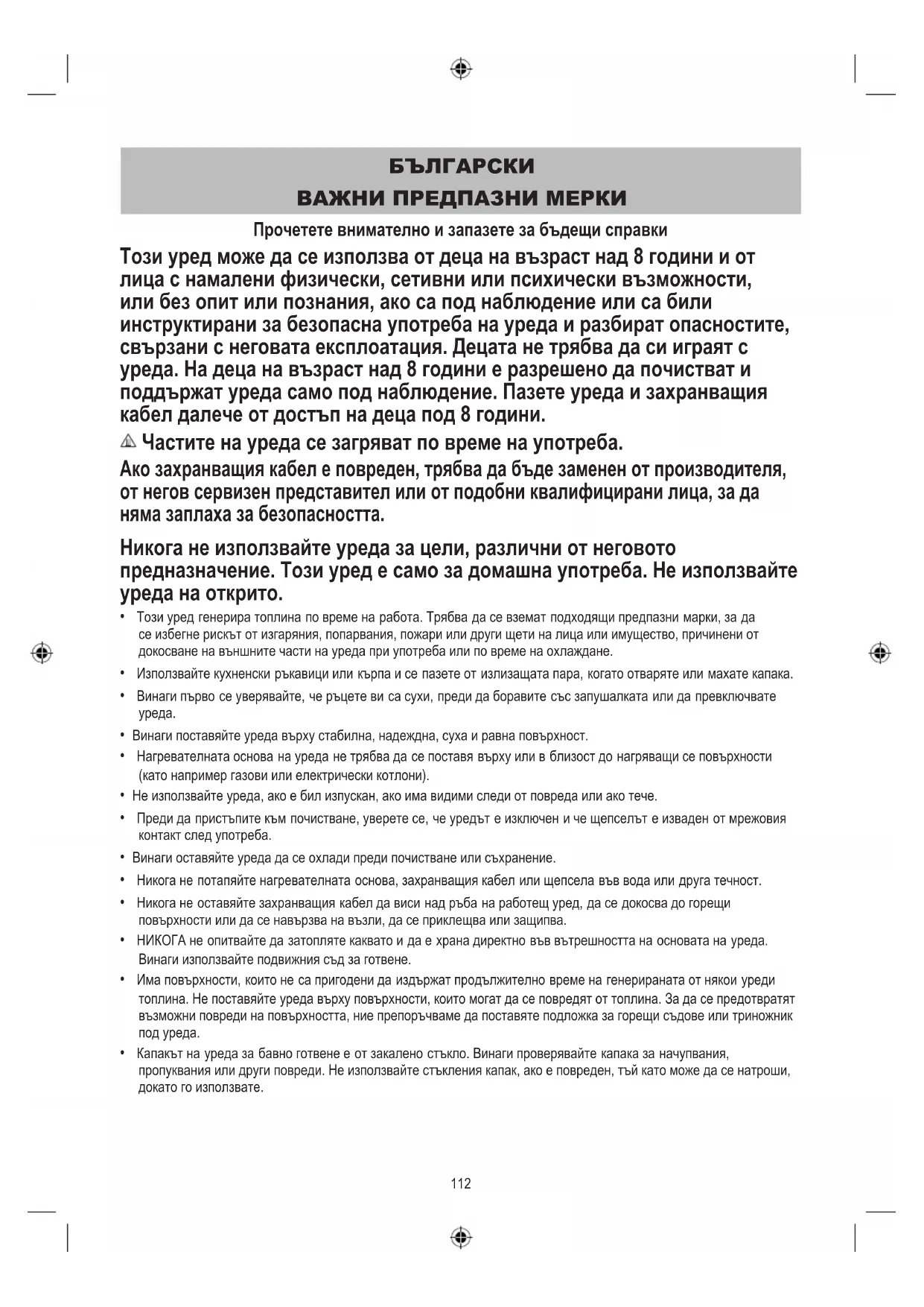 ВАЖНИ ПРЕДПАЗНИ МЕРКИ Прочетете внимателно и запазете за бъдещи справки Този уред може да се използва от деца на възраст над 8 години и от лица с намалени физически, сетивни или психически възможности, или без опит или познания, ако са под наблюдение или са били инструктирани за безопасна употреба на уреда и разбират опасностите, свързани с неговата експлоатация. Децата не трябва да си играят с уреда. На деца на възраст над 8 години е разрешено да почистват и поддържат уреда само под наблюдение. Пазете уреда и захранващия кабел далече от достъп на деца под 8 години. Частите на уреда се загряват по време на употреба. Ако захранващия кабел е повреден, трябва да бъде заменен от производителя, от негов сервизен представител или от подобни квалифицирани лица, за да няма заплаха за безопасността. Никога не използвайте уреда за цели, различни от неговото предназначение. Този уред е само за домашна употреба. Не използвайте уреда на открито.