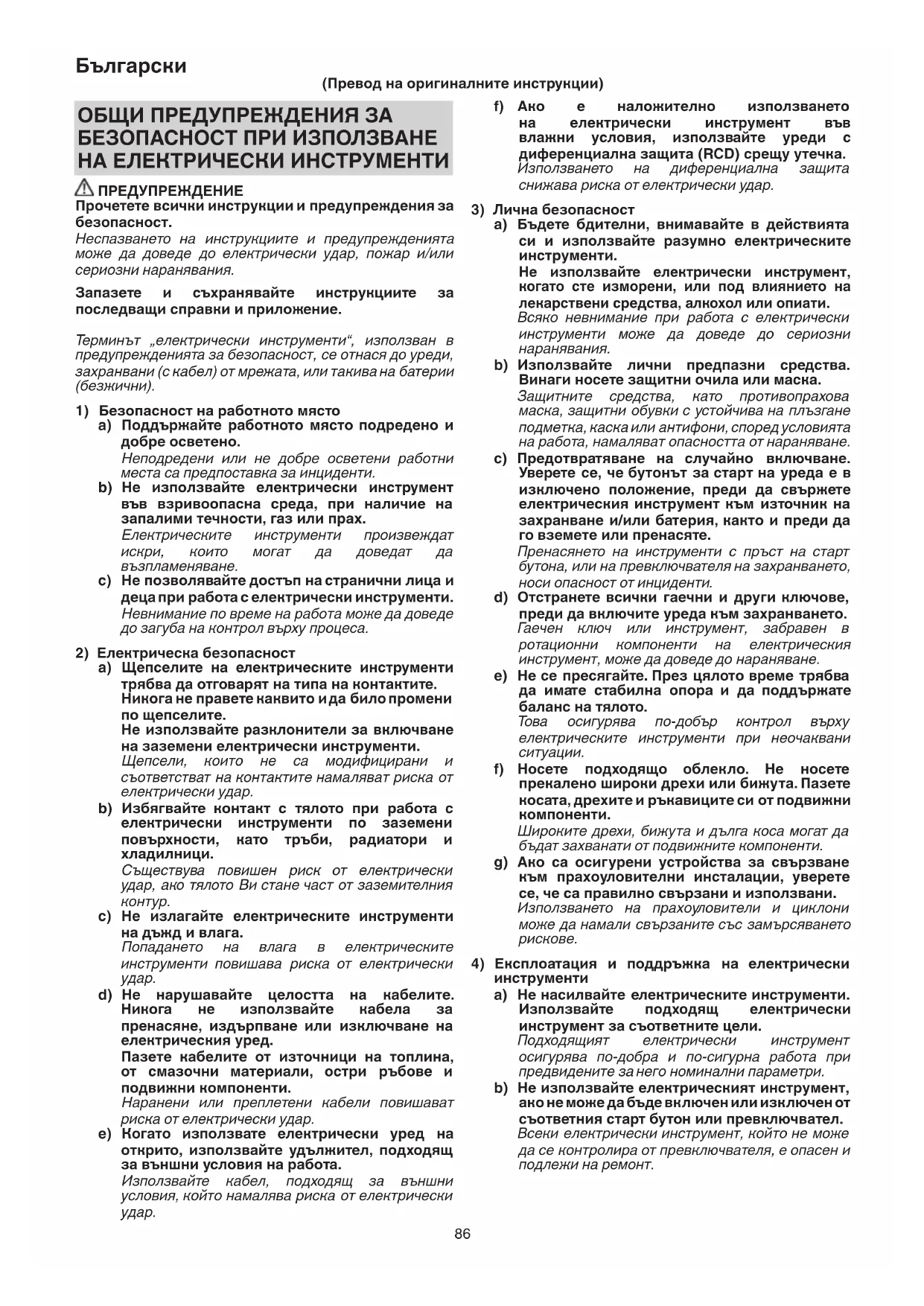 инструменти a) Не насилвайте електрическите инструменти. Използвайте подходящ електрически инструмент за съответните цели. Подходящият електрически инструмент осигурява по-добра и по-сигурна работа при предвидените за него номинални параметри. b) Не използвайте електрическият инструмент, ако не може да бъде включен или изключен от съответния старт бутон или превключвател. Всеки електрически инструмент, който не може да се контролира от превключвателя, е опасен и подлежи на ремонт. ОБЩИ ПРЕДУПРЕЖДЕНИЯ ЗА БЕЗОПАСНОСТ ПРИ ИЗПОЛЗВАНЕ НА ЕЛЕКТРИЧЕСКИ ИНСТРУМЕНТИ ПРЕДУПРЕЖДЕНИЕ Прочетете всички инструкции и предупреждения за безопасност. Неспазването на инструкциите и предупрежденията може да доведе до електрически удар, пожар и/или сериозни наранявания. Запазете и съхранявайте инструкциите за последващи справки и приложение. Терминът „електрически инструменти“, използван в предупрежденията за безопасност, се отнася до уреди, захранвани (с кабел) от мрежата, или такива на батерии (безжични).