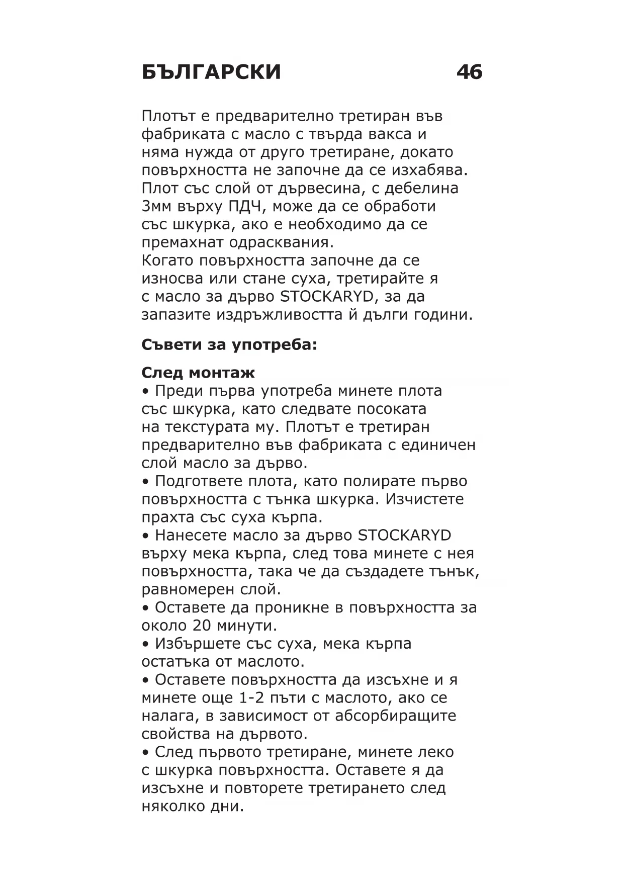 - Na čistenie nikdy nepoužívajte oceľovú drôtenku či čistiace prostriedky s kyselinami alebo podobné výrobky, pretože môžu poškriabať povrch. UPOZORNENIE Akúkoľvek tkaninu, ktorá je nasiaknutá týmto produktom hneď po použití namočte do vody alebo uzavrite do vzduchotesného obalu, aby ste predišli riziku samovznietenia.46 Плотът е предварително третиран във фабриката с масло с твърда вакса и няма нужда от друго третиране, докато повърхността не започне да се изхабява. Плот със слой от дървесина, с дебелина 3мм върху ПДЧ, може да се обработи със шкурка, ако е необходимо да се премахнат одрасквания. Когато повърхността започне да се износва или стане суха, третирайте я с масло за дърво STOCKARYD, за да запазите издръжливостта й дълги години. Съветизаупотреба: