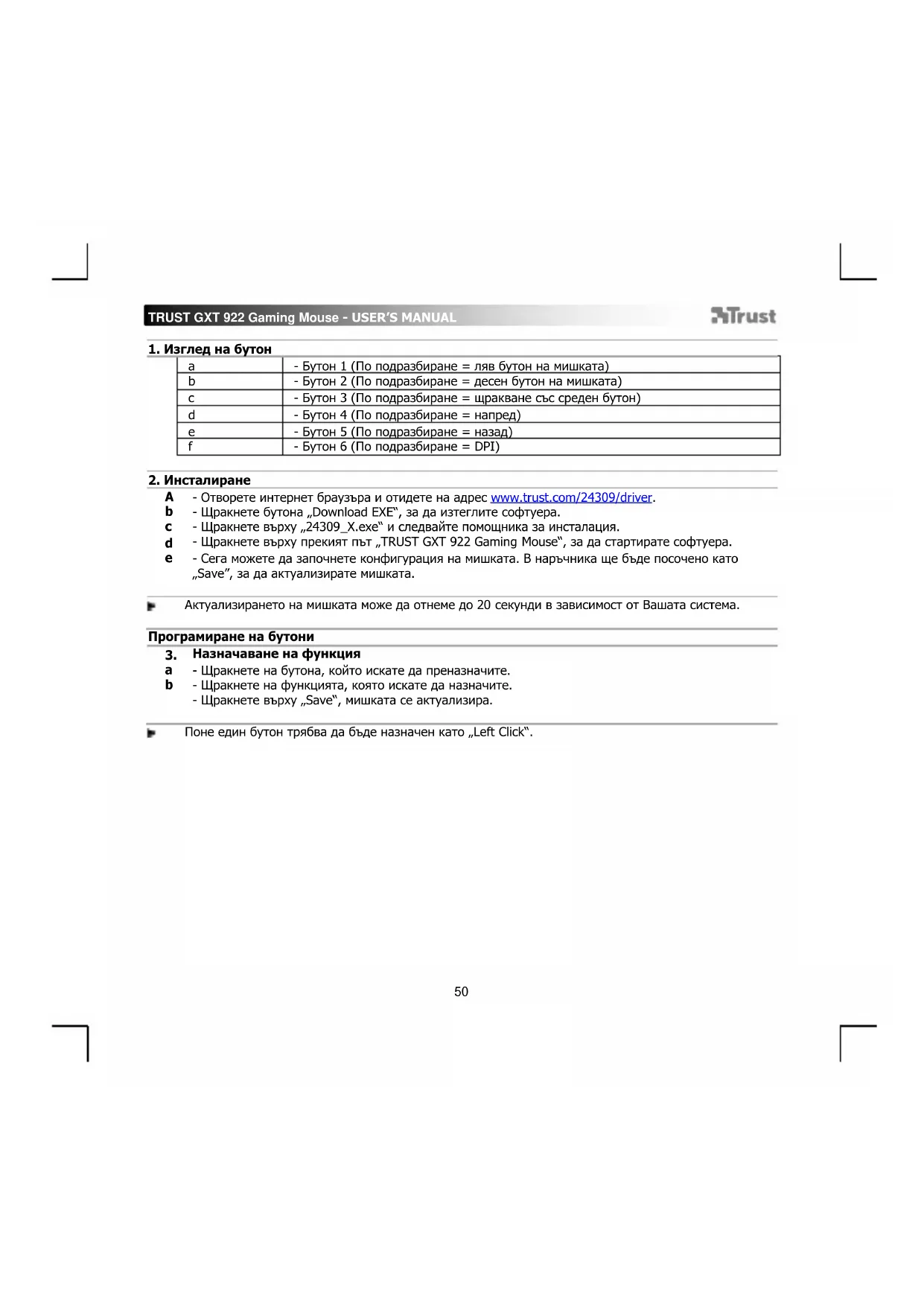 - Отворете интернет браузъра и отидете на адрес www.trust.com/24309/driver. - Щракнете бутона „Download EXE“, за да изтеглите софтуера. - Щракнете върху „24309_X.exe“ и следвайте помощника за инсталация. - Щракнете върху прекият път „TRUST GXT 922 Gaming Mouse“, за да стартирате софтуера. - Сега можете да започнете конфигурация на мишката. В наръчника ще бъде посочено като „Save”, за да актуализирате мишката. Актуализирането на мишката може да отнеме до 20 секунди в зависимост от Вашата система. Програмиране на бутони