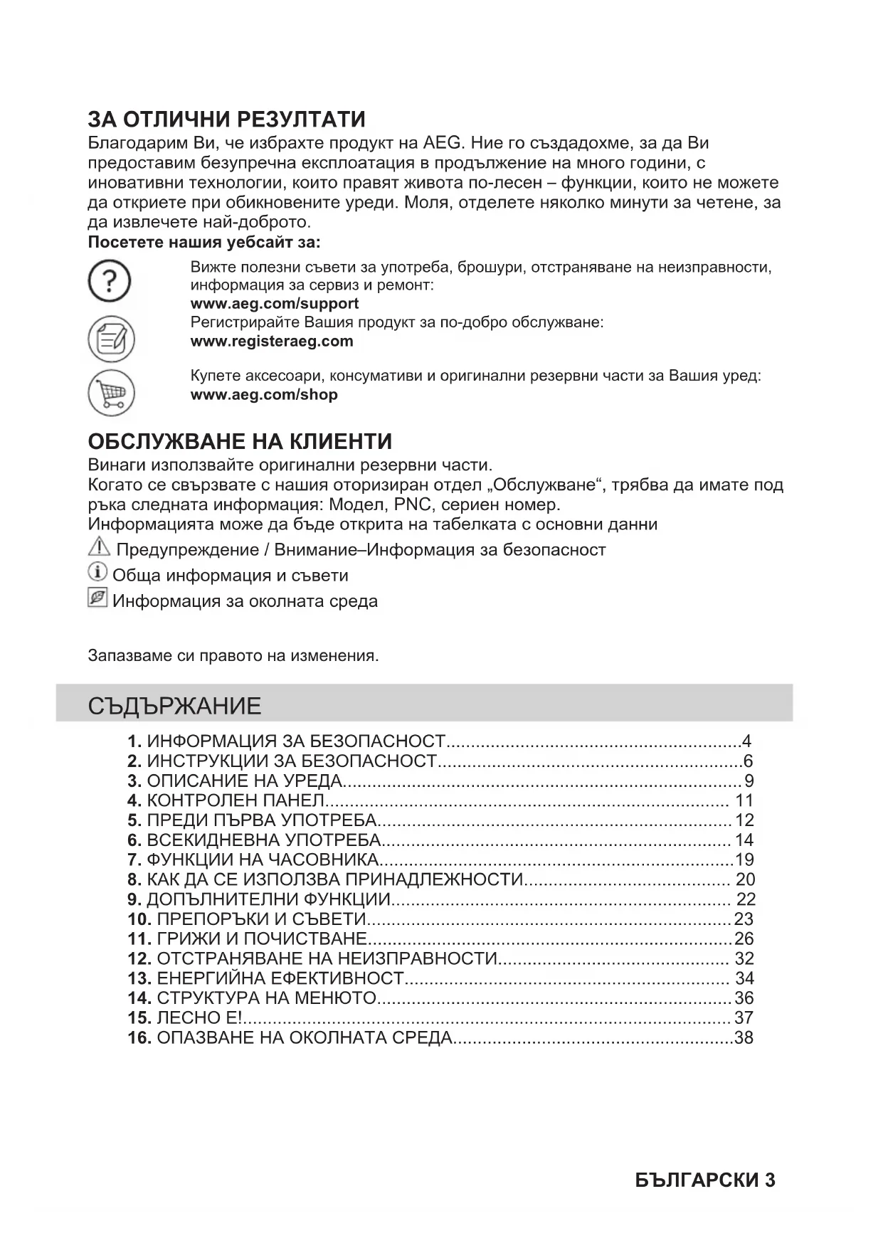 2ЗА ОТЛИЧНИ РЕЗУЛТАТИ Благодарим Ви, че избрахте продукт на AEG. Ние го създадохме, за да Ви предоставим безупречна експлоатация в продължение на много години, с иновативни технологии, които правят живота по-лесен – функции, които не можете да откриете при обикновените уреди. Моля, отделете няколко минути за четене, за да извлечете най-доброто. Посетете нашия уебсайт за: Вижте полезни съвети за употреба, брошури, отстраняване на неизправности,информация за сервиз и ремонт:www.aeg.com/supportРегистрирайте Вашия продукт за по-добро обслужване:www.registeraeg.comКупете аксесоари, консумативи и оригинални резервни части за Вашия уред:www.aeg.com/shop ОБСЛУЖВАНЕ НА КЛИЕНТИ Винаги използвайте оригинални резервни части. Когато се свързвате с нашия оторизиран отдел „Обслужване“, трябва да имате под ръка следната информация: Модел, PNC, сериен номер. Информацията може да бъде открита на табелката с основни данни Предупреждение / Внимание–Информация за безопасност Обща информация и съвети Информация за околната среда Запазваме си правото на изменения.