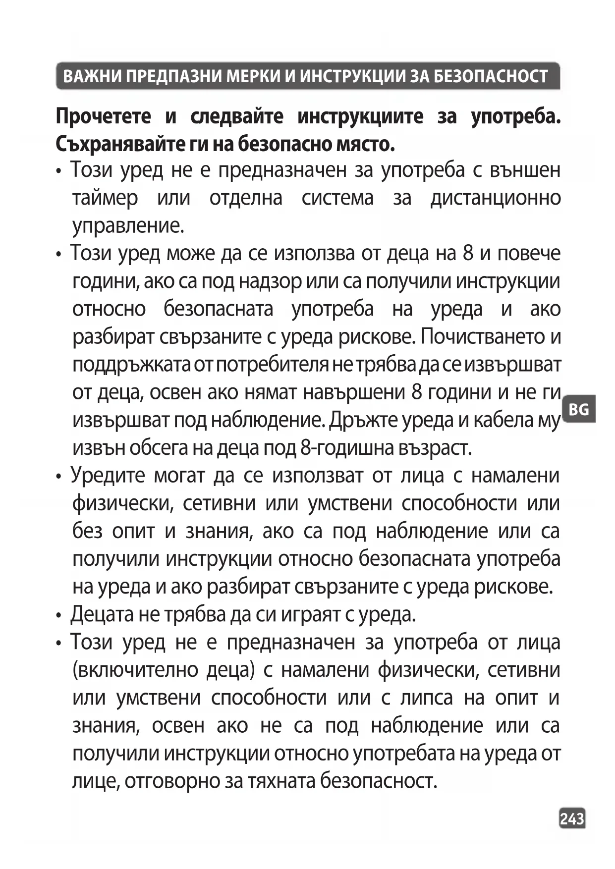- Този уред може да се използва от деца на 8 и повече години, ако са под надзор или са получили инструкции относно безопасната употреба на уреда и ако разбират свързаните с уреда рискове. Почистването и поддръжката от потребителя не трябва да се извършват от деца, освен ако нямат навършени 8 години и не ги извършват под наблюдение. Дръжте уреда и кабела му извън обсега на деца под 8-годишна възраст.