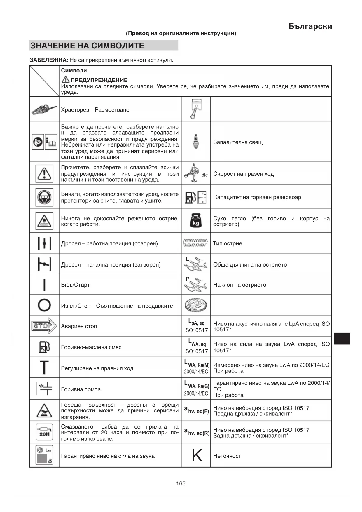 (Превод на оригиналните инструкции) ЗНАЧЕНИЕ НА СИМВОЛИТЕ ЗАБЕЛЕЖКА: Не са прикрепени към някои артикули.