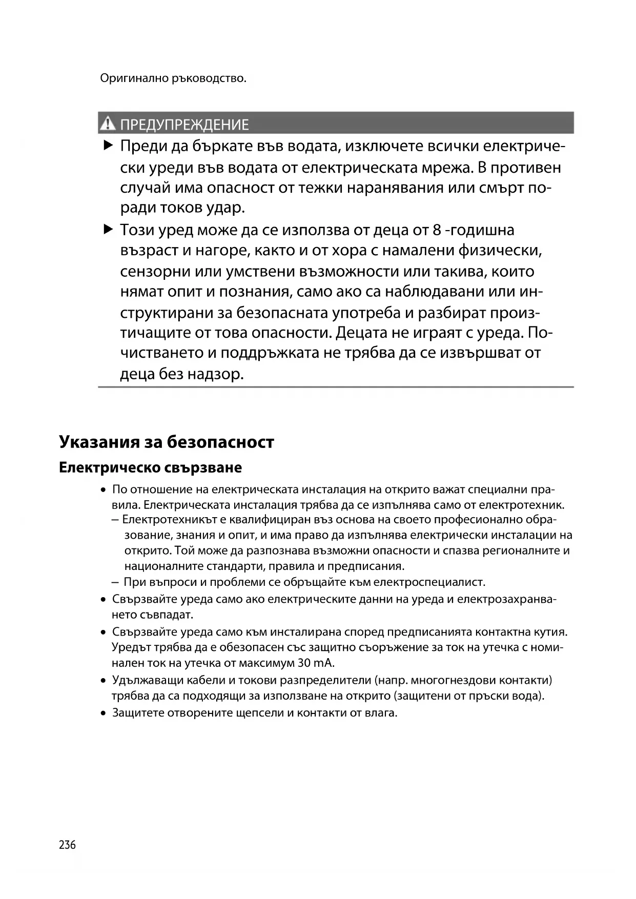 ПРЕДУПРЕ ЖДЕ НИЕ ПРЕДУПРЕЖДЕНИЕ Преди да бъркате във водата, изключете всички електриче- ски уреди във водата от електрическата мрежа. В противен случай има опасност от тежки наранявания или смърт по- ради токов удар. Този уред може да се използва от деца от 8 -годишна възраст и нагоре, както и от хора с намалени физически, сензорни или умствени възможности или такива, които нямат опит и познания, само ако са наблюдавани или ин- структирани за безопасната употреба и разбират произ- тичащите от това опасности. Децата не играят с уреда. По- чистването и поддръжката не трябва да се извършват от деца без надзор.