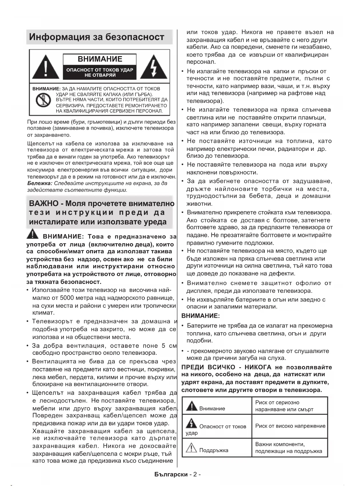 ОПАСНОСТ ОТ ТОКОВ УДАРНЕ ОТВАРЯЙВНИМАНИЕ: ЗА ДА НАМАЛИТЕ ОПАСНОСТТА ОТ ТОКОВ УДАР НЕ СВАЛЯЙТЕ КАПАКА (ИЛИ ГЪРБА). ВЪТРЕ НЯМА ЧАСТИ, КОИТО ПОТРЕБИТЕЛЯТ ДА СЕРВИЗИРА. ПРЕДОСТАВЕТЕ РЕМОНТИРАНЕТО НА КВАЛИФИЦИРАНИЯ СЕРВИЗЕН ПЕРСОНАЛ. Бележка: Следвайте инструкциите на екрана, за да задействате съответните функции. При лошо време (бури, гръмотевици) и дълги периоди без ползване (заминаване в почивка), изключете телевизора от захранването. Щепселът на кабела се използва за изключване на телевизора от електрическата мрежа и затова той трябва да е винаги годен за употреба. Ако телевизорът не е изключен от електрическата мрежа, той все още ще консумира електроенергия във всички ситуации, дори телевизорът да е в режим на готовност или да е изключен. ВАЖНО - Моля прочетете внимателно тези инструкции преди да инсталирате или използвате уреда ВНИМАНИЕ: Това е предназначено за употреба от лица (включително деца), които са способни/имат опита да използват такива устройства без надзор, освен ако не са били наблюдавани или инструктирани относно употребата на устройството от лице, отговорно за тяхната безопасност.