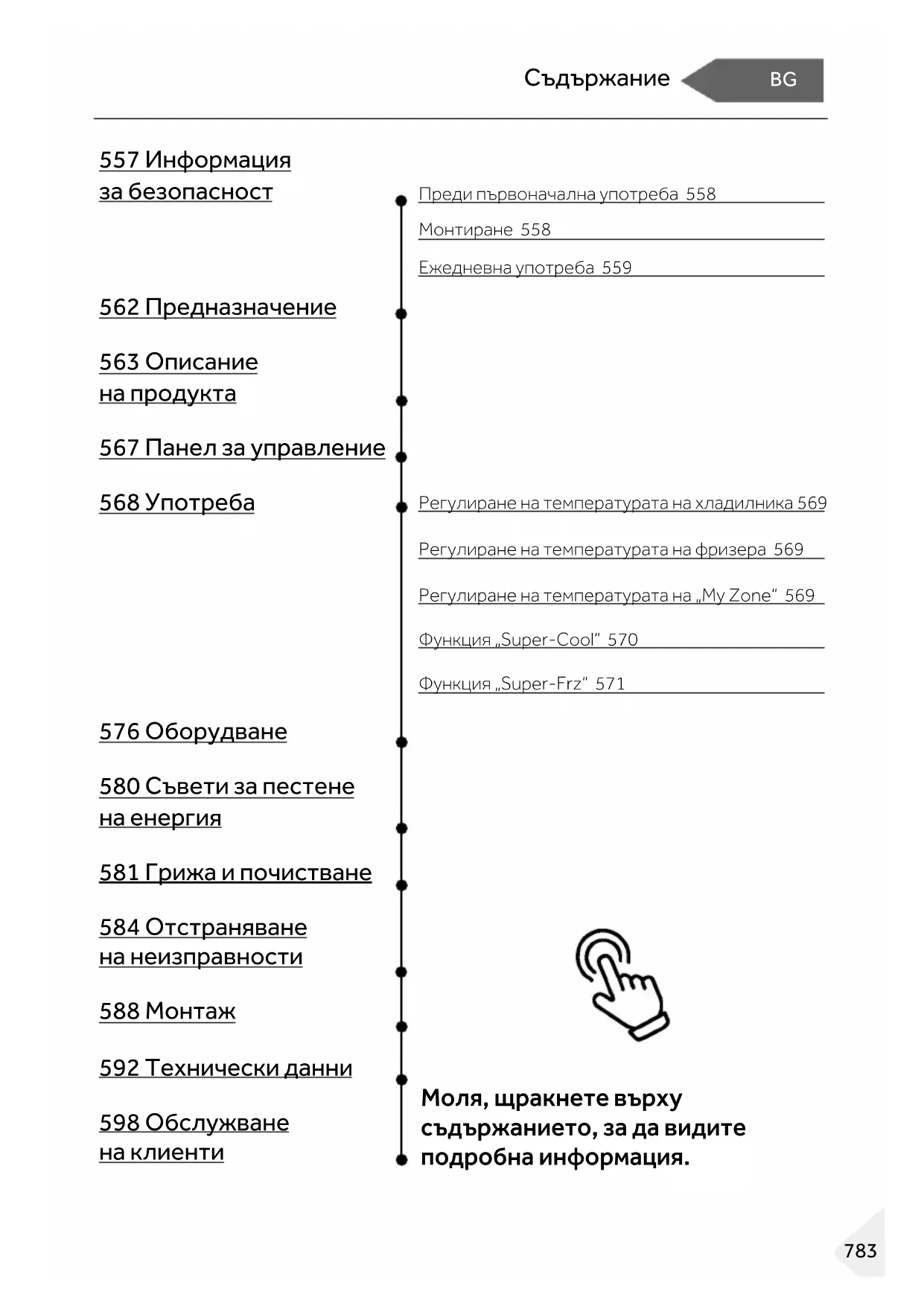 557 Информация за безопасност Преди първоначална употреба 558 Монтиране 558 Ежедневна употреба 559 562 Предназначение 563 Описание на продукта 567 Панел за управление 568 Употреба Регулиране на температурата на хладилника 569 Регулиране на температурата на фризера 569 Регулиране на температурата на „My Zone“ 569 Функция „Super-Cool“ 570 Функция „Super-Frz“ 571 576 Оборудване 580 Съвети за пестене