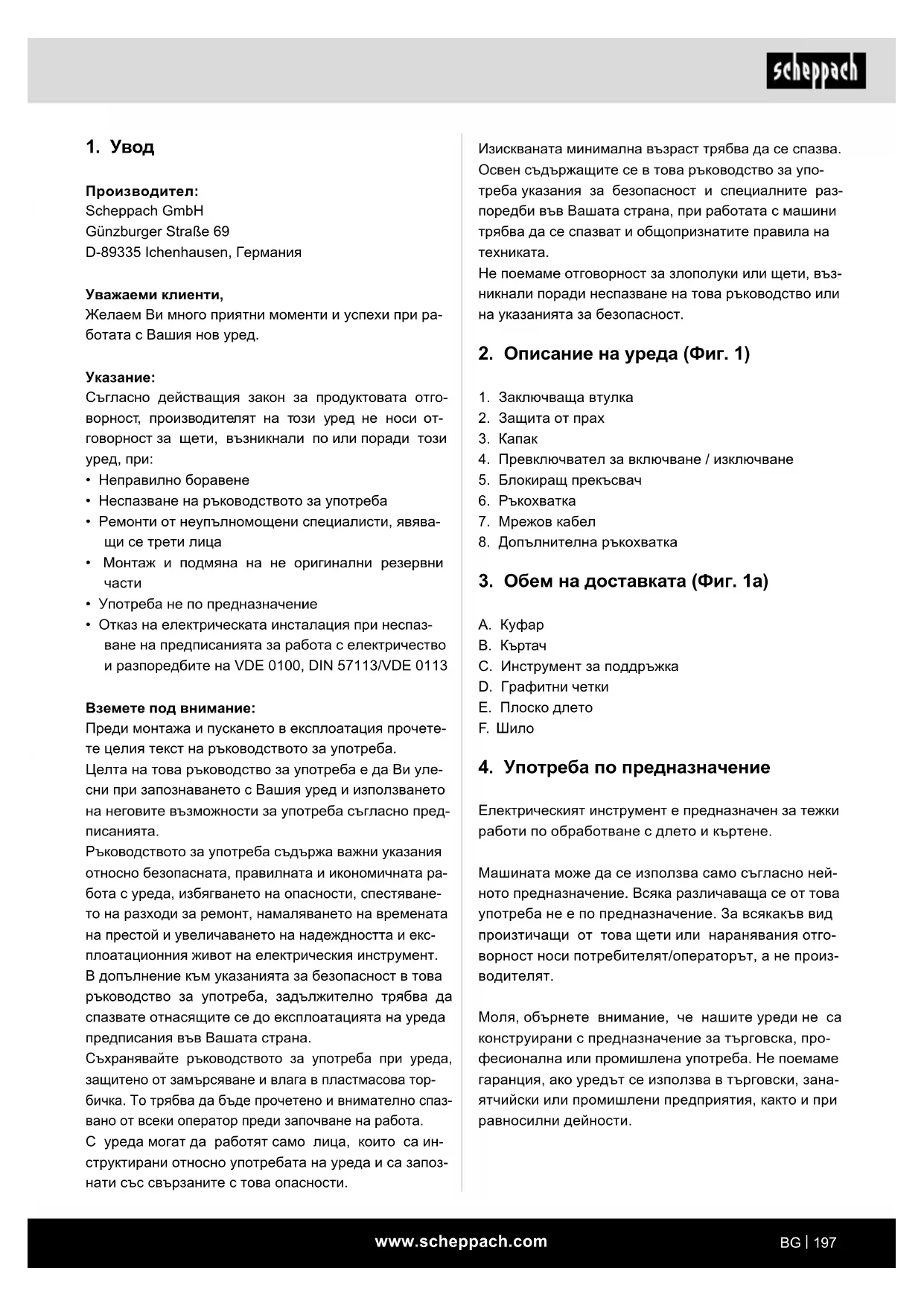 Ръководството за употреба съдържа важни указания относно безопасната, правилната и икономичната ра- бота с уреда, избягването на опасности, спестяване- то на разходи за ремонт, намаляването на времената на престой и увеличаването на надеждността и екс- плоатационния живот на електрическия инструмент. В допълнение към указанията за безопасност в това ръководство за употреба, задължително трябва да спазвате отнасящите се до експлоатацията на уреда предписания във Вашата страна. Съхранявайте ръководството за употреба при уреда, защитено от замърсяване и влага в пластмасова тор- бичка. То трябва да бъде прочетено и внимателно спаз- вано от всеки оператор преди започване на работа. С уреда могат да работят само лица, които са ин- структирани относно употребата на уреда и са запоз- нати със свързаните с това опасности.www.scheppach.com
