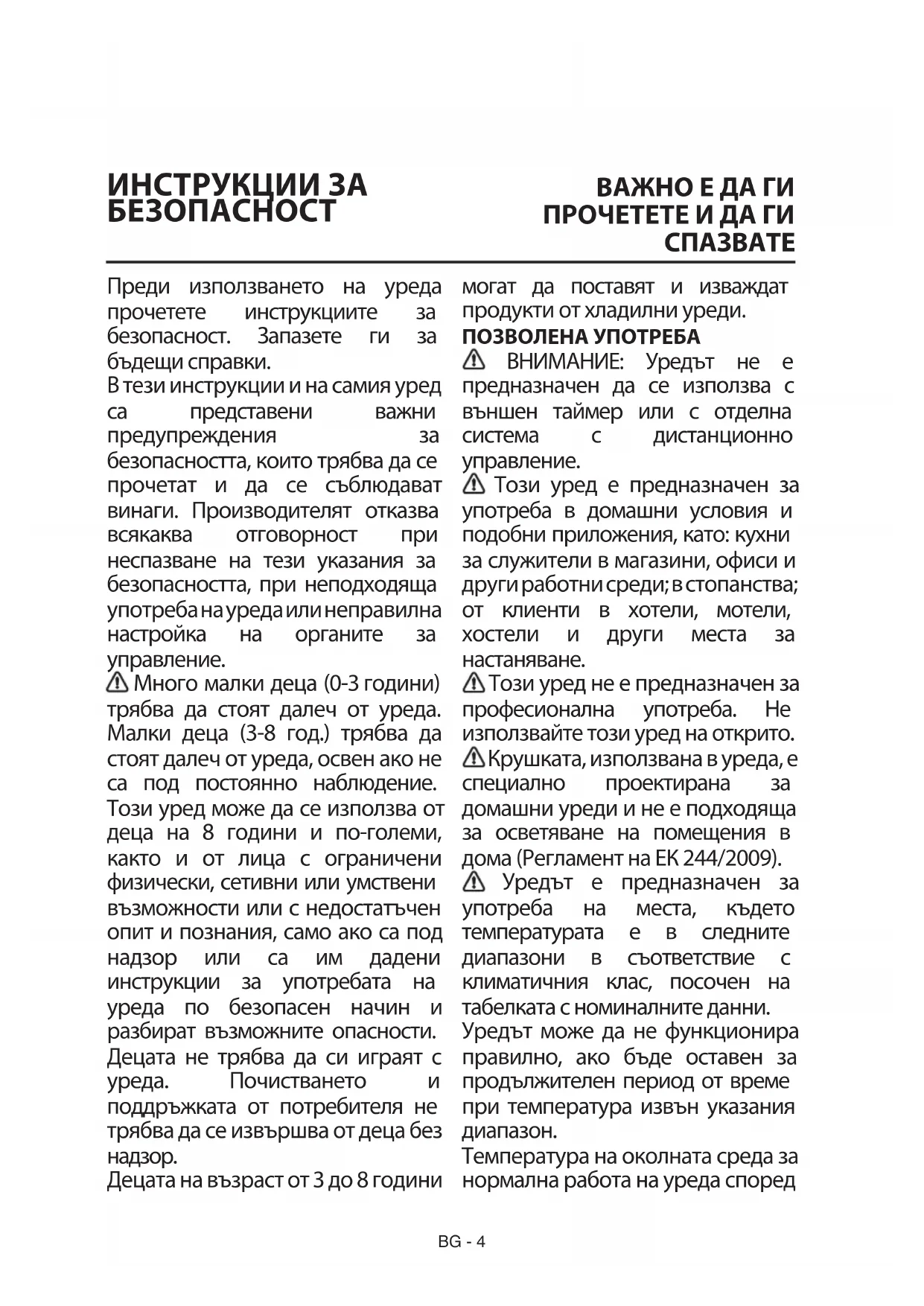 Преди използването на уреда прочетете инструкциите за безопасност. Запазете ги за бъдещи справки. В тези инструкции и на самия уред са представени важни предупреждения за безопасността, които трябва да се прочетат и да се съблюдават винаги. Производителят отказва всякаква отговорност при неспазване на тези указания за безопасността, при неподходяща употреба на уреда или неправилна настройка на органите за управление. Много малки деца (0-3години) трябва да стоят далеч от уреда. Малки деца (3-8 год.) трябва да стоят далеч от уреда, освен ако не са под постоянно наблюдение. Този уред може да се използва от деца на 8 години и по-големи, както и от лица с ограничени физически, сетивни или умствени възможности или с недостатъчен опит и познания, само ако са под надзор или са им дадени инструкции за употребата на уреда по безопасен начин и разбират възможните опасности. Децата не трябва да си играят с уреда. Почистването и поддръжката от потребителя не трябва да се извършва от деца без