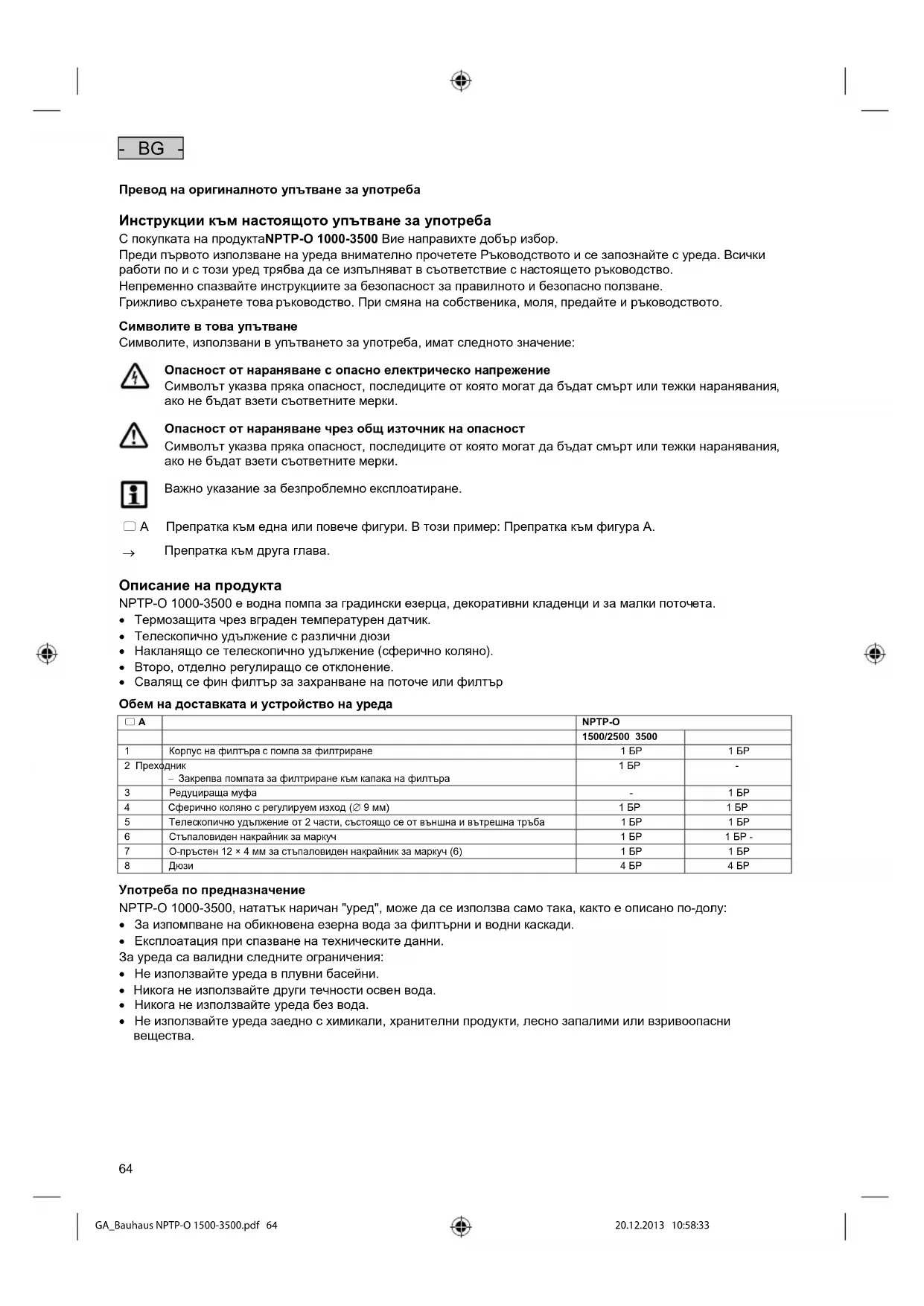 - Поддържайте контакта и мрежовия щепсел сухи. GA_Bauhaus NPTP-O 1500-3500.pdf 65 20.12.2013 10:58:3366 - BG - Монтаж и свързване Експлоатация като помпа за поточе или филтрираща помпа