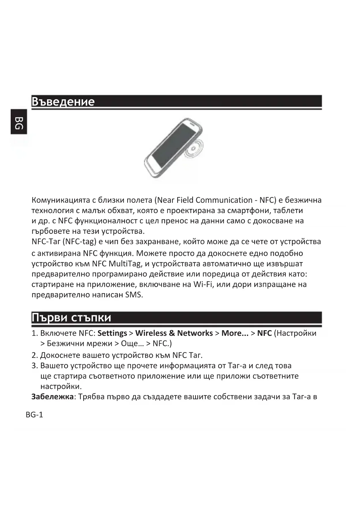 Забележка: Трябва първо да създадете вашите собствени задачи за Таг-а вBG BG-2 приложението наречено "NFC Task Launcher" (Стартер на NFC задачи) или други подобни приложения инсталирани на вашето устройство.