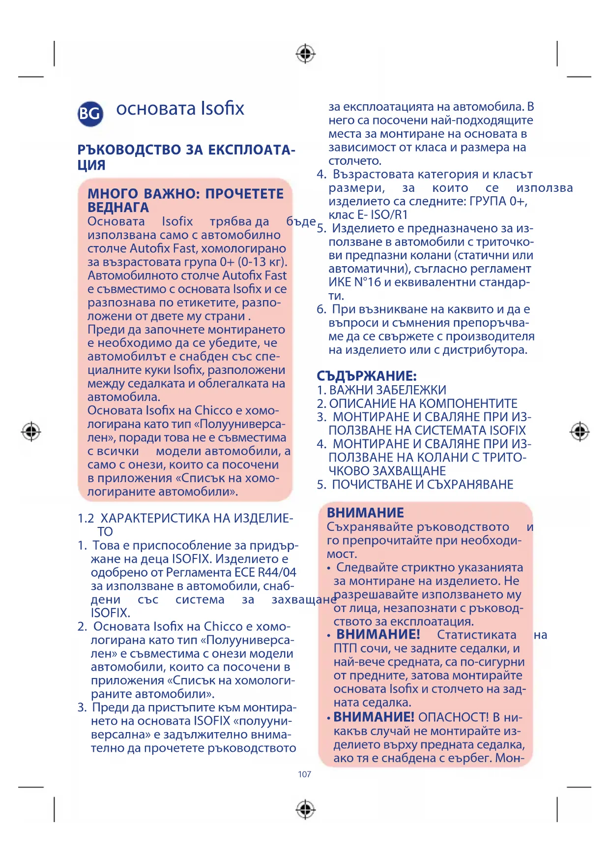 6.Привъзникваненакаквитоидае въпросиисъмненияпрепоръчва- медасесвържетеспроизводителя наизделиетоилисдистрибутора. СЪДЪРЖАНИЕ: 1.ВАЖНИЗАБЕЛЕЖКИ 2.ОПИСАНИЕНАКОМПОНЕНТИТЕ 3.МОНТИРАНЕИСВАЛЯНЕПРИИЗ- ПОЛЗВАНЕНАСИСТЕМАТАISOFIX 4.МОНТИРАНЕИСВАЛЯНЕПРИИЗ- ПОЛЗВАНЕНАКОЛАНИСТРИТО- ЧКОВОЗАХВАЩАНЕ 5.ПОЧИСТВАНЕИСЪХРАНЯВАНЕ