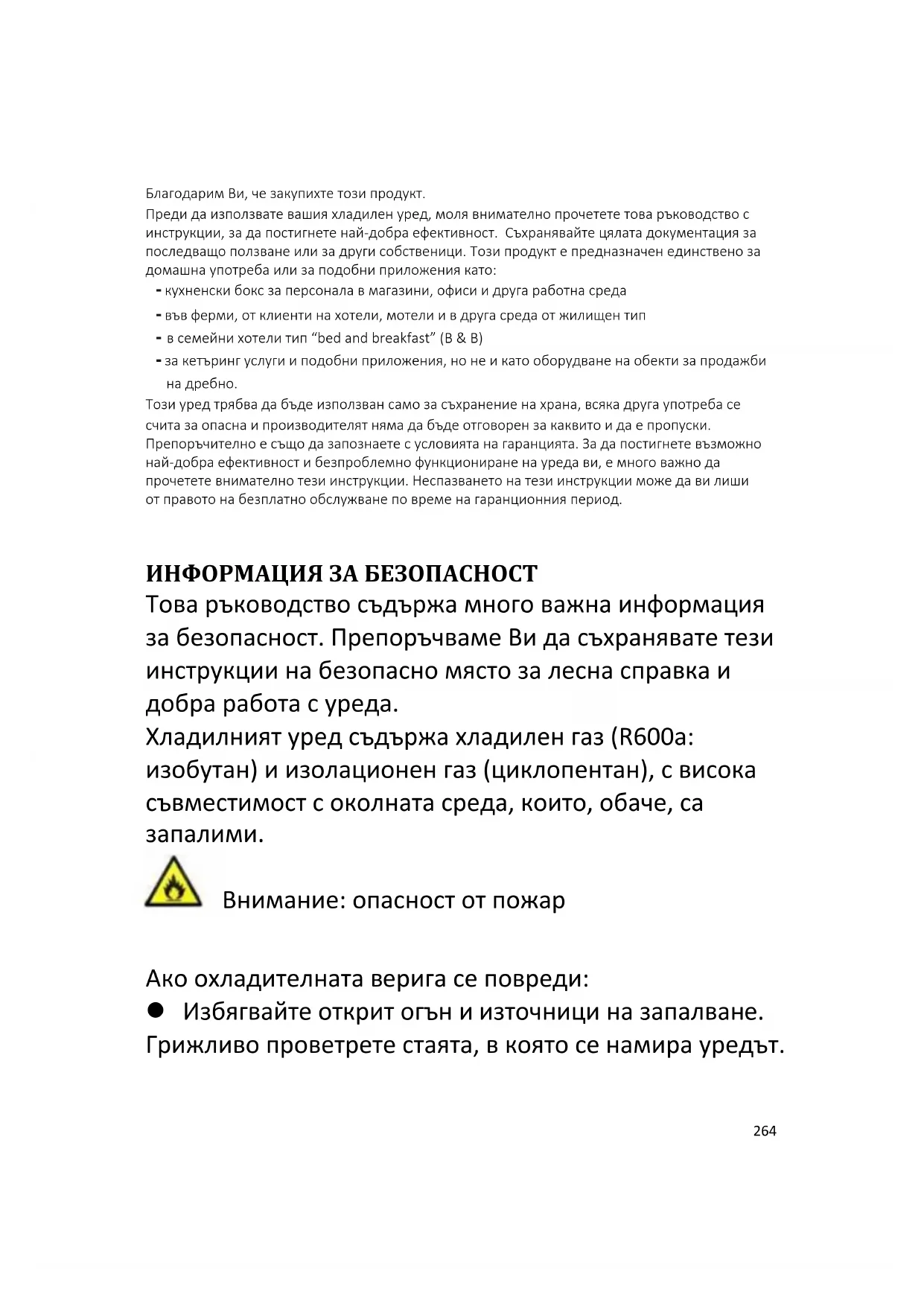 Абсолютно трябва да се избягва използването на открит огън или на електрическо оборудване като печки, парочистачки, свещи, газени лампи и подобни, за да се ускори процесът на размразяване. Никога не използвайте вода за измиването на мястото на компресора, след почистване избършете добре със сухо парче плат, за да предотвратите ръжда. Препоръчително е да поддържате щепсела чист, натрупването на прекалено много прах по щепсела може да причини пожар. Продуктът е предназначен и изработен само за домашна употреба. Гаранцията ще бъде невалидна, ако продуктът бъде монтиран или използван в търговски или нежилищни битови помещения. Продуктът трябва да бъде монтиран правилно, разположен и използван в съответствие с инструкциите, съдържащи се в предоставената книжка с инструкции за потребителя. Гаранцията е приложима само за нови продукти и не може да се прехвърля, ако продуктът бъде продаден на трети лица. Нашата фирма не носи никаква отговорност за случайни или последващи щети. Гаранцията по никакъв начин не редуцира вашите законови или субективни права.271